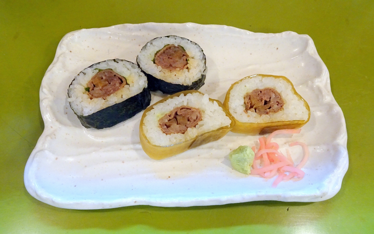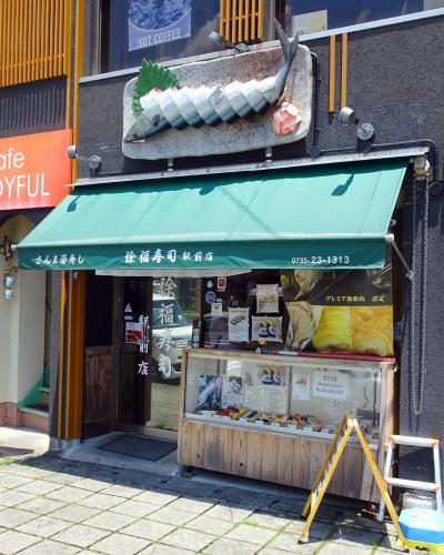 JR新宮駅ロータリーのすぐ東。持ち帰り注文もできますが,座敷2テーブルとカウンターに4~5席あり,店内でも食べられます。さんまの姿寿司が有名ですが,今回は,お昼に,熊野牛の巻き寿司をいただしました。甘辛く煮込んだ熊野牛を,大葉とともに巻いた海苔巻きと,ゴボウと一緒に昆布で巻いた昆布巻きがあり,それぞれ1本1,500円ですが,1個170円から何個でも注文できます。いずれも熊野牛の旨みが出てて,なかなかの美味ですが,個人的には海苔巻きの方に軍配。200円の赤だしも,具にえびまで入ってグッド