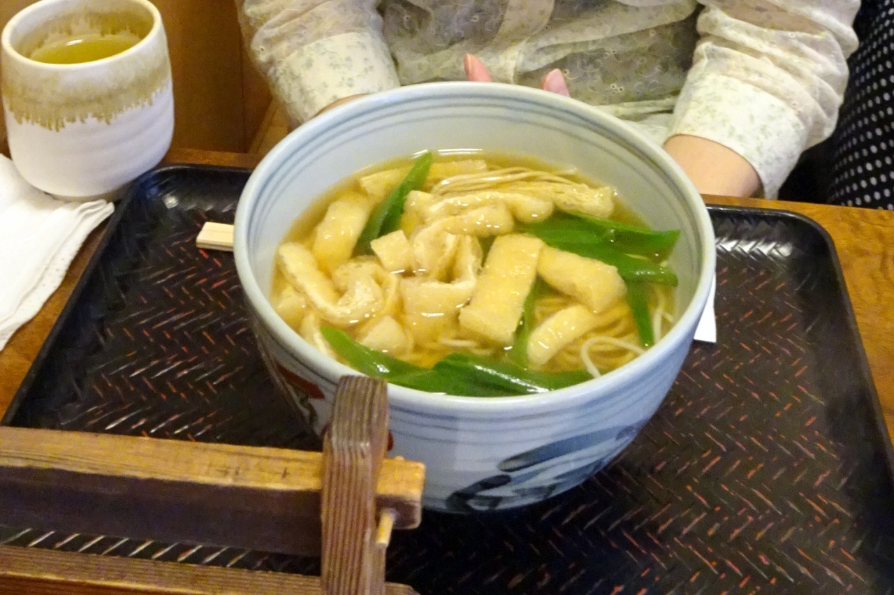 天龍寺の真ん前という立地もあり,お昼時は混みます。私は天ぷらそばを,家内はきざみきつねうどんをいただきました。お値段は高めですが,大きめの海老天が2尾入り,細かめの衣がサクサク。昆布と鰹の出汁の効いたおつゆもなかなか結構。きざみの油揚げは,嵯峨豆腐森富の油揚げを使っているとのこと。