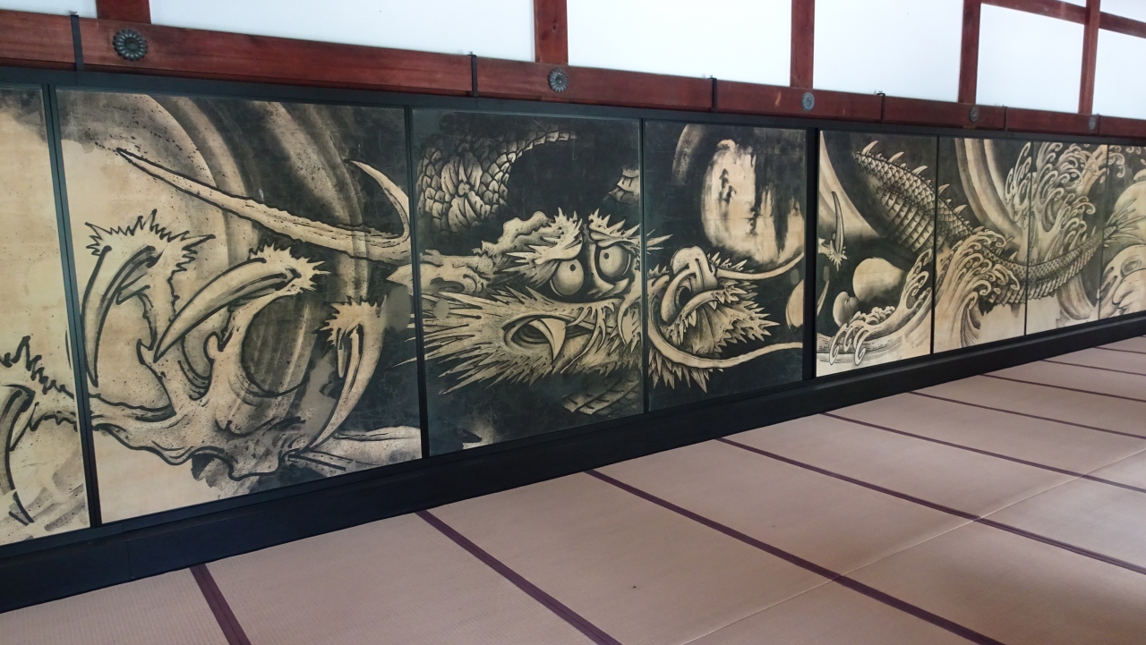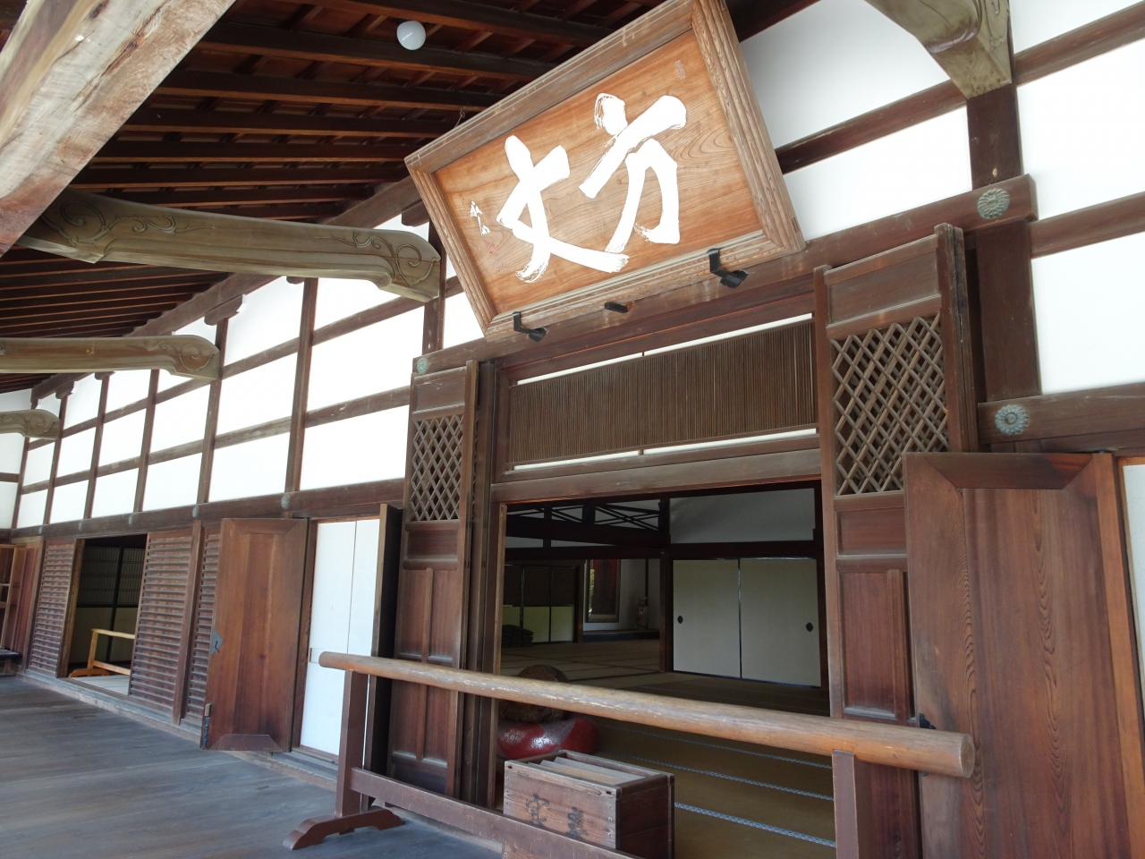大方丈は,明治32年(1899年)建築の天龍寺最大の建物。「方丈」の扁額は,第8代管長の関牧翁老師の筆。本尊の釈迦如来坐像は,平安時代後期の作。正面と裏側に幅広い縁台があり,特に裏側の縁台には,多くの観光客が腰かけて小憩しており,私達も曹源池庭園を眺めながらのんびりしました。小方丈の書院にも,畳に足を伸ばす人が大勢いました。また,ボストン美術館に所蔵されている,曽我蕭白の「雲竜図」が,文化財未来継承プロジェクトにより,デジタル複製されて展示されていました。