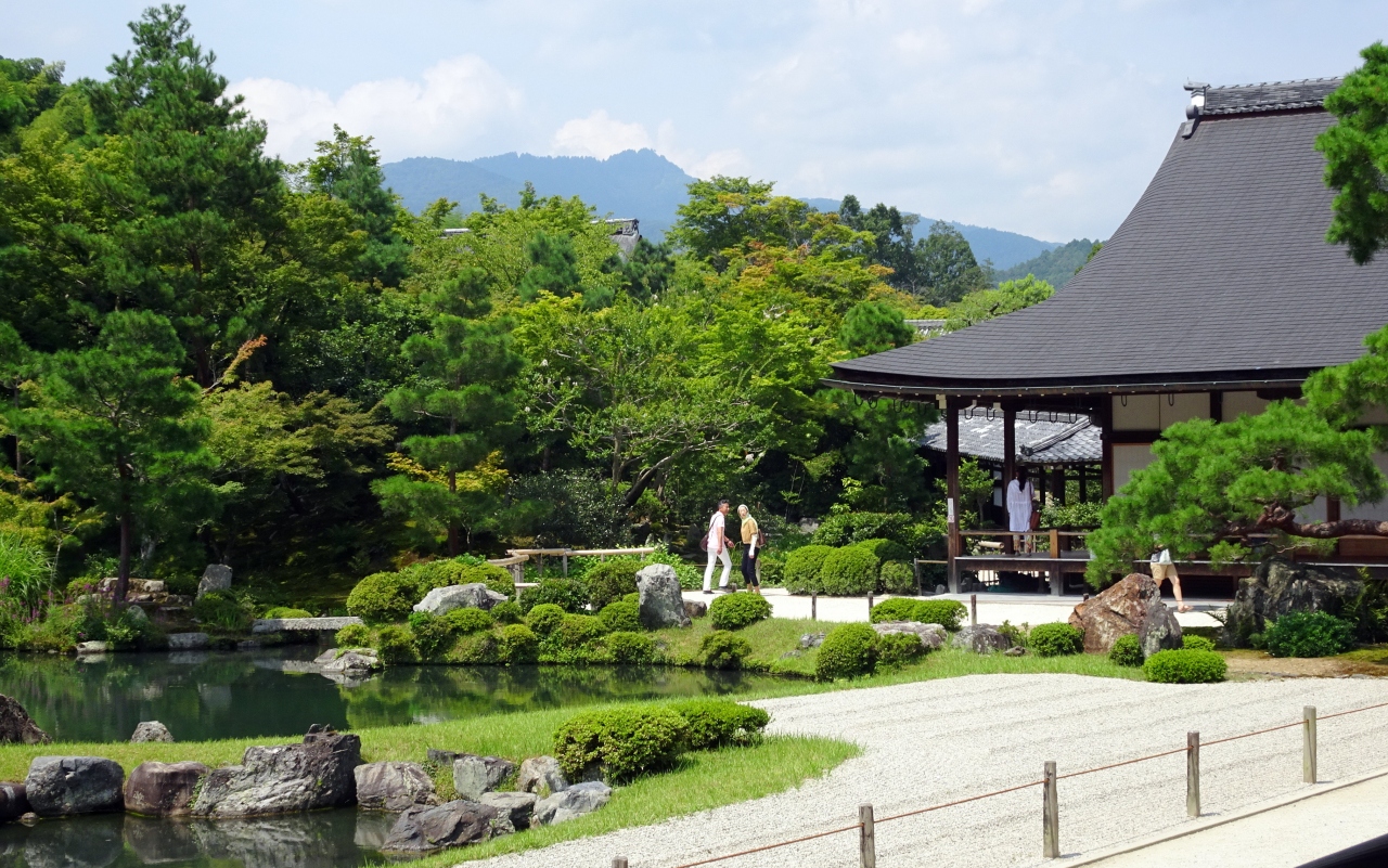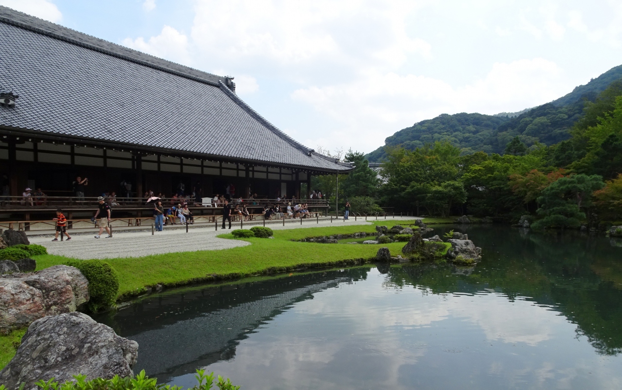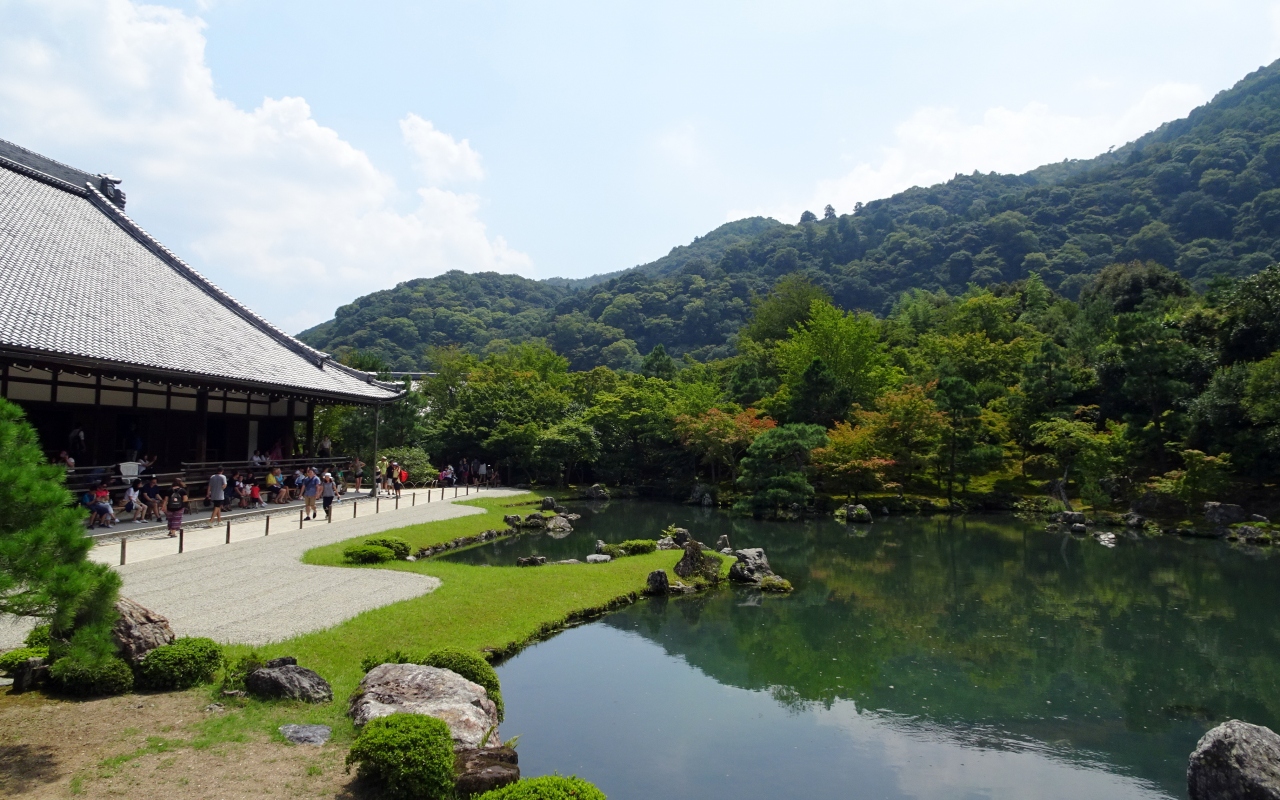 庭園だけの入場は500円。曹源池を中心とした池泉回遊式庭園は,夢窓疎石の作庭で,日本で最初の史跡・特別名勝に指定されています。曹源池の名は,池の泥をあげたとき池中から「曹源一滴」と記した石碑が現れたところから名付けられたとのこと。嵐山や亀山を借景し,四季折々の顔を見せてくれますので,大方丈の縁台に腰かけて,この庭を眺めるだけでも落ち着いた時間を過ごすことができます。