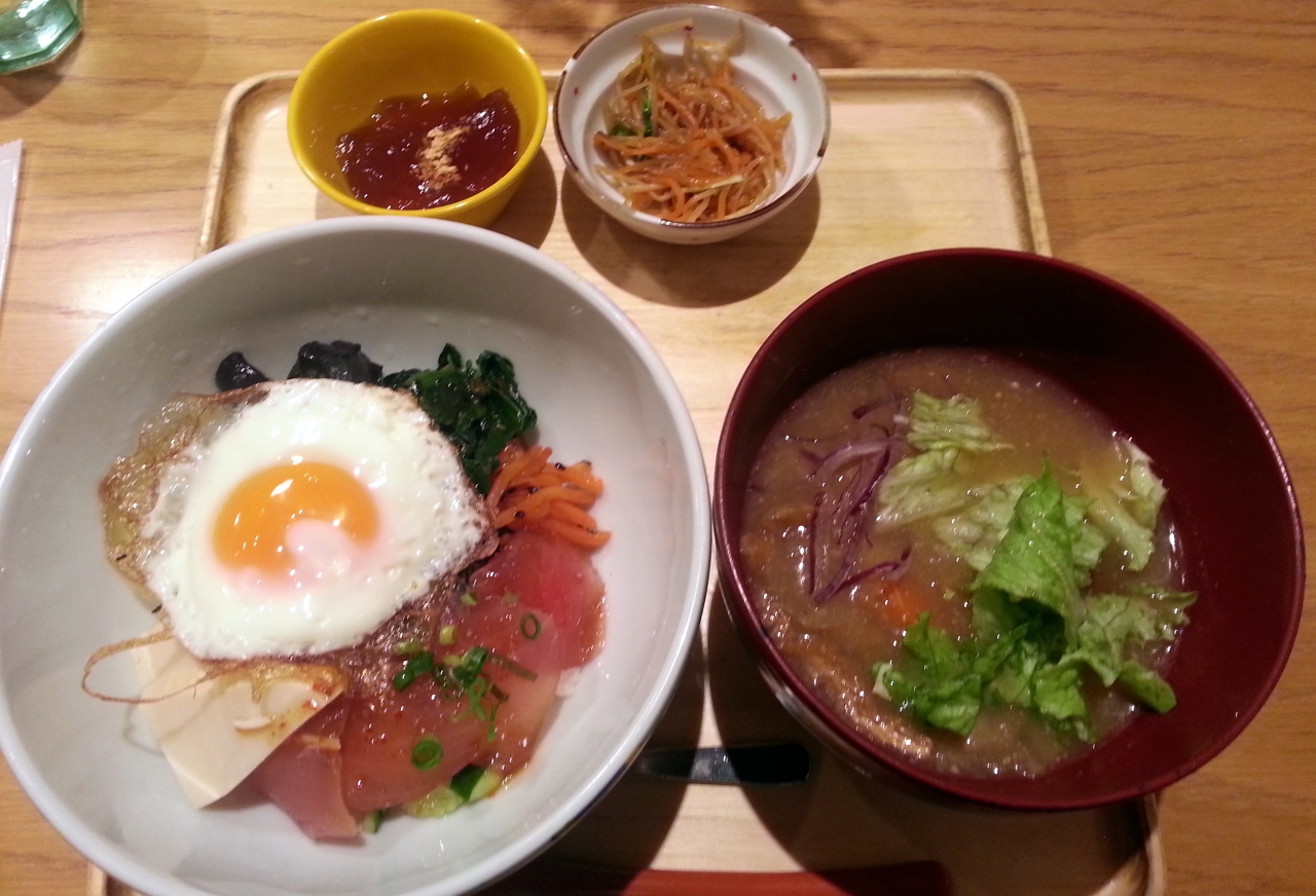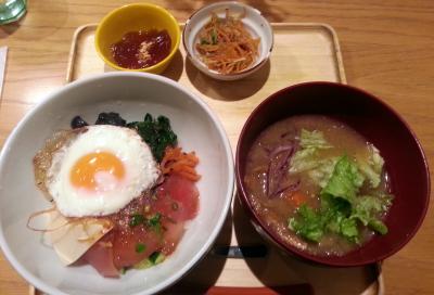京都駅前地下街ポルタにある,変わり種の丼ぶり屋さん。海鮮系とお肉系があり,すべて野菜たっぷりのお味噌汁,おばんざいの小鉢,甘味が付いたバラエティ豊かなメニュー。ハヤシライスのメニューもあります。色々目移りしましたが,今回は,まぐろのビビンごはんをオーダー。まぐろにビビンバの甘辛だれがよくマッチして,なかなかグッドでした。丼ぶりのご飯は女性向きに控えめになっているので,しっかり食べたい方は+50で大盛りにした方がいいかも。奥に長い店内で,結構席数がありますので,混んでる時間帯も待たされずに席に案内されることが多いと思います。