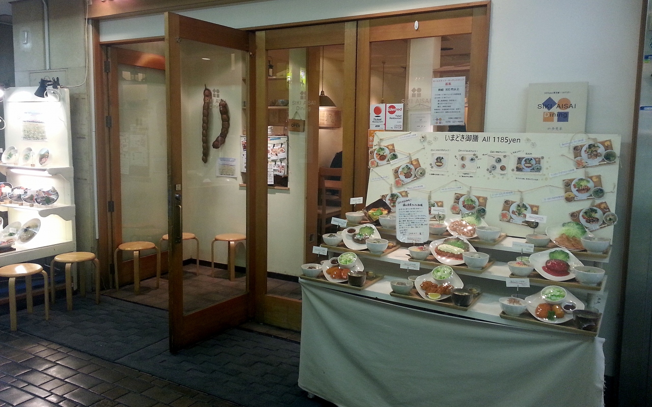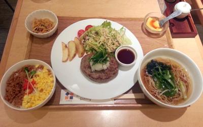 さんプラザB1にあるダイニング。「いまどき御膳」という定食は,全て1,185円。メインのおかずは種類も豊富で,鶏そぼろ,胡麻じゃこ,鮭,高菜の4種からトッピングを選べれる御飯と,十割蕎麦,うどん,味噌汁から選べる汁物のほか,小鉢とミニデザートが付く充実のセット内容で,お腹いっぱいに。今回は,夕飯に大根おろしハンバーグ御膳をいただきましたが,ハンバーグが結構ボリュームがあり,大根おろしもたっぷり。付け合わせ野菜も多めでヘルシー。十割蕎麦もグッド。