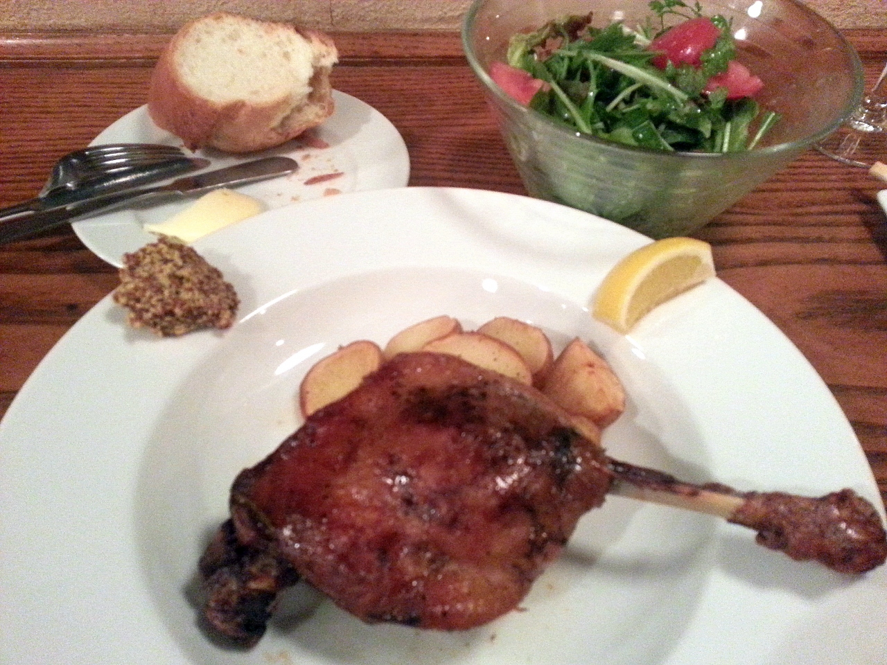 地下鉄烏丸御池駅5番出口から,三条通りを東へ入って1本目の通りを南に下ってすぐのビルの1階。カウンター席のほか,テーブル席も数セットあり,パリ下町のブラッスリーという感じで,カジュアルにフレンチが楽しめるお店。料理のメニューやワインの種類も多く,選ぶのが楽しい。今回は,独り晩御飯で訪店。グラスワインと鴨モモ肉のコンフィをいただきました。お肉はとても柔らかく,香ばしく焼かれており,なかなかの美味。サラダとバケットを付けて,3,000円以内と,リーズナブルでした。