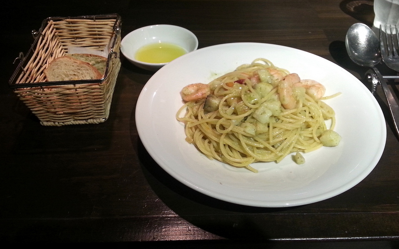中山手通から北野坂への入口のビルの地下にある,隠れ家的なお店。入口には,「明石新浜漁港直送昼網鮮魚のイタリアン」の看板があり,旬の魚介にこだわったメニュー。ランチはリーズナブルなパスタランチが用意されており,前菜5種の盛合せとバケットがセットされ,パスタはその日のメニュー(看板)数種類からチョイスできる。この日は,海老と長芋のジェノベーゼソースをいただいた。プリプリの海老と長芋のマッチングが面白く,ソースが絶妙。次回は,特別なディナーに利用したい。