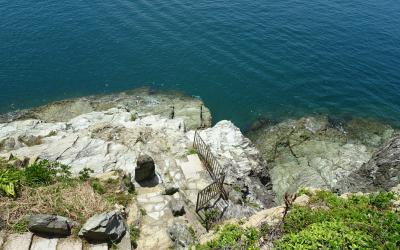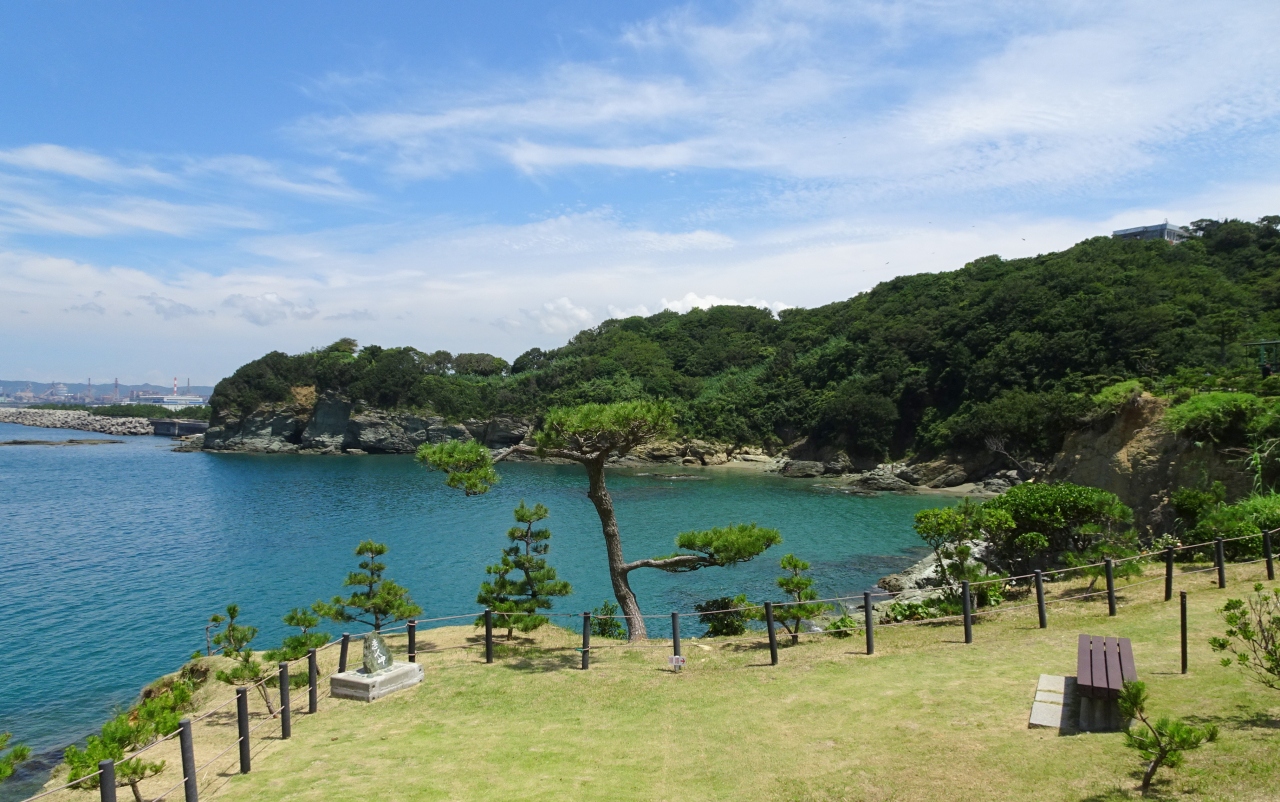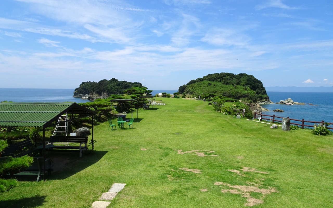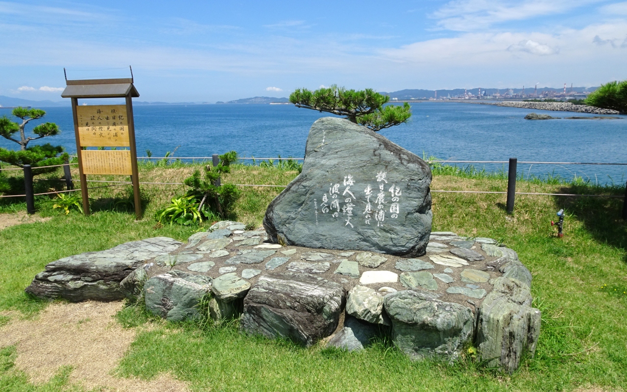和歌山バスの雑賀崎遊園バス停から徒歩約15分。海に突き出た「番所の鼻」という半島に広がる芝生庭園(入園料600円)。かつて紀州藩が海の防備のために設けた遠見番所が名前の由来で,黒船来航時にはお台場も築かれた。また,聖武天皇行幸の際,お供の藤原卿が雑賀浦の漁火を見て歌を詠んだという万葉ゆかりの場所でもあり,園内に歌碑があります。西正面には大島と中之島,南側には雑賀埼灯台を見渡せます。急な階段で岩場まで下りることもでき,釣りを楽しむ方もいました。よく手入れされた芝生が広がり,暑い夏でなかったら,のんびりと腰を下して過ごしたい感じのところです。