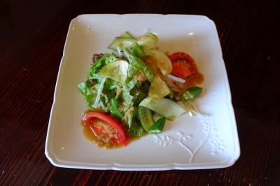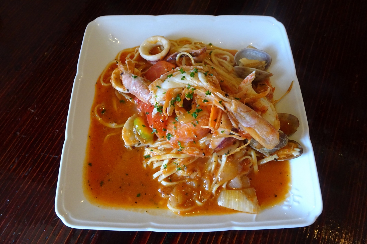 和歌浦漁港に面し,屋上テラス席もある和イタリアンのお店。午後1時を回っていましたが,土曜日ということもあり,10分以上待って席へ。ビフカツやオムライスなどのセットもありますが,漁港が近いこともあり,新鮮な魚介を使ったパスタ等がお薦め。この日は,魚介パスタ(1200円)とフレッシュ野菜サラダ(400円)を注文。パスタは,トマト,クリーム,オイル,和風の4種から選べます。トマトソースをチョイスしましたが,魚介とよくマッチしてグッドでした。