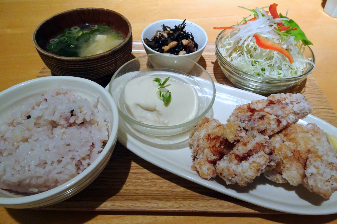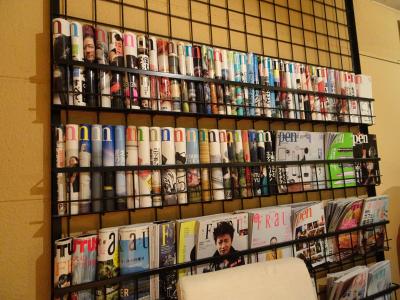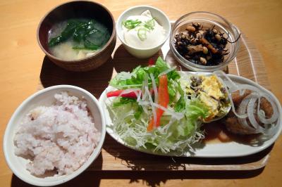 ぶらくり丁大通り(築地通り)のドン・キホーテのあるビルの2階。ケーキ等も人気ですが,日替わり,週替わりなど,ランチメニューも多い。この日は,家内が竜田揚げランチを,私が黒豆ハンバーグランチを注文(850円)。いずれも野菜いっぱいでヘルシー。店内は,思いのほか広く,PenやFRaUなどの情報雑誌もよく揃えられており,ゆったり過ごすことができそう。