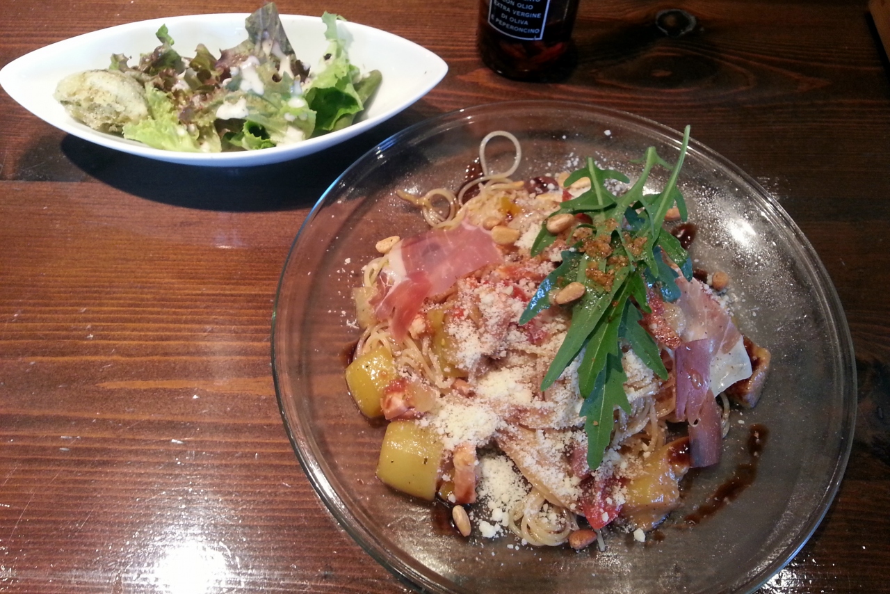 けやき大通りから北に二筋入った,十番丁にあるワイン食堂。前から気になっていたお店で,平日のランチに訪店。二人掛けのテーブルが3組くらいと,カウンター席8~10くらいの店内。ランチ時は近くのOL客が多く利用されているようです。ランチセットは,3種類のパスタから選ぶセットで,前菜とドルチェが付いたAセット(1,300円),前菜が付いたBセット(1,100円),サラダが付いたCセット(920円)があります(いずれもドリンク付き)。この日は,非常に暑かったので,冷製パスタをチョイスしましたが,細麺にバルサミコ系のソースがよく絡まってなかなか結構でした。