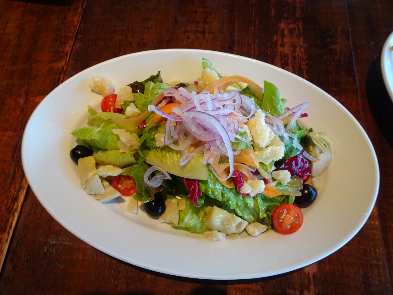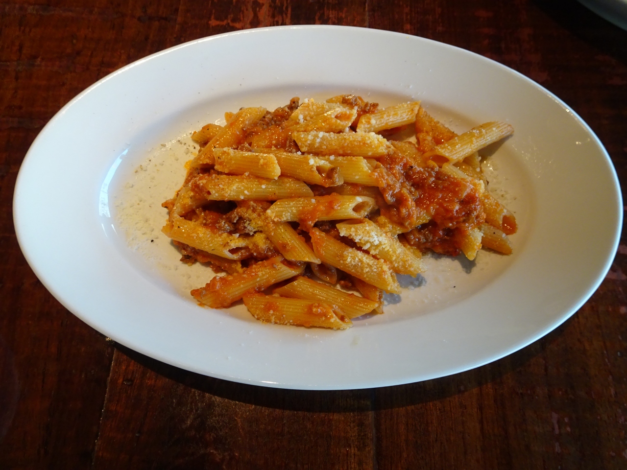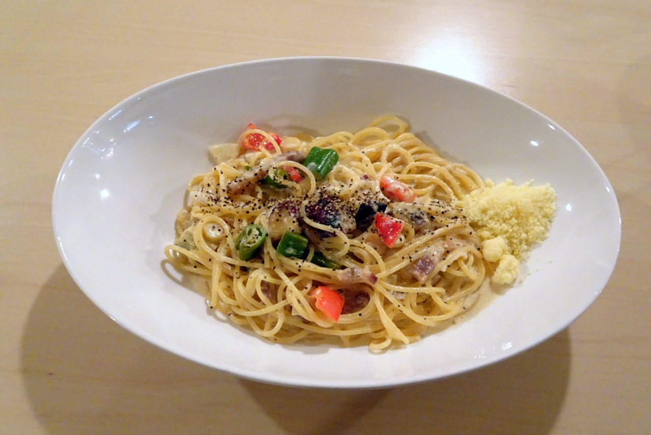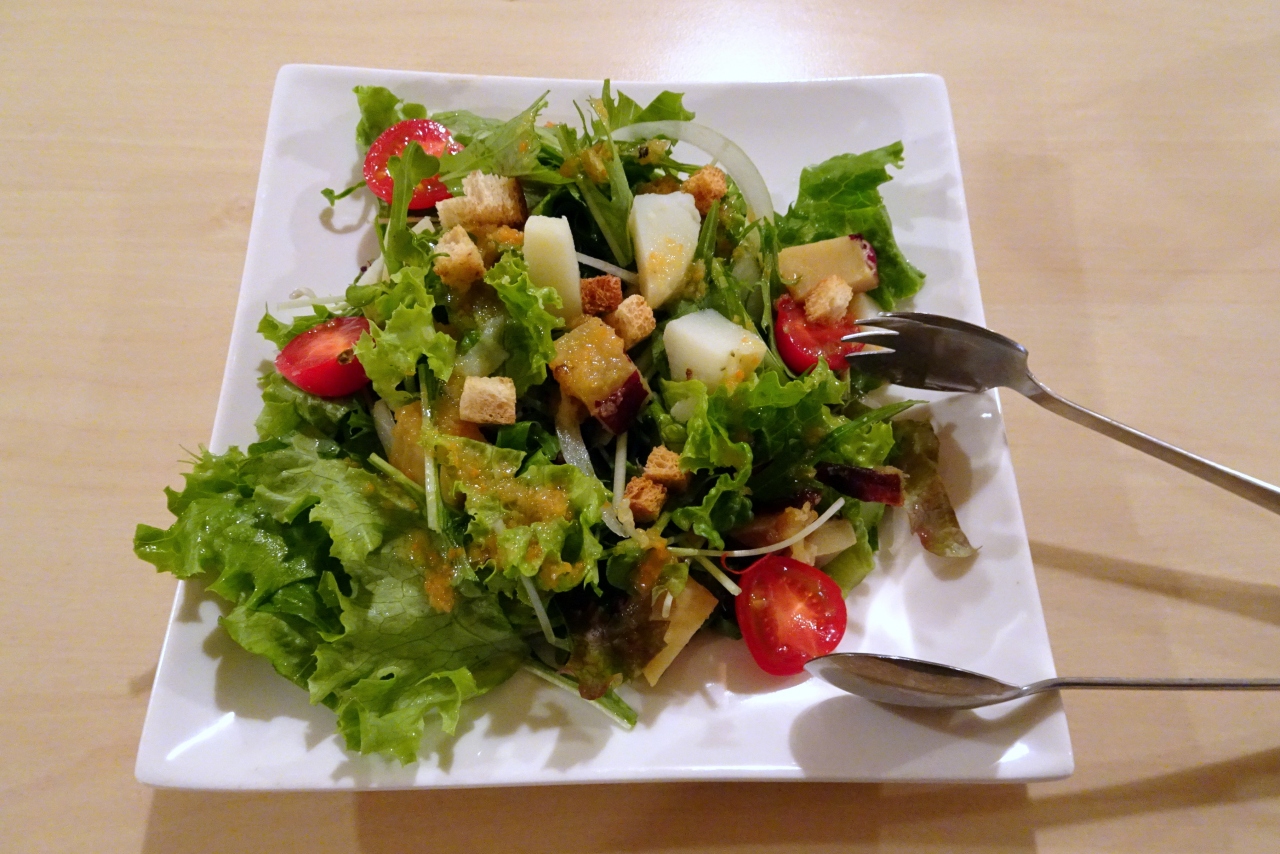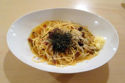 ぶらくり丁商店街内西側にある,「にこにこのうえん」が運営する農園レストラン。ピザやパスタを中心に,有機野菜にこだわったメニュー。週末ランチに何回か利用していますが,季節に応じて具材の野菜も変わり,毎回美味しくいただいています。今回は,家内とサラダ(580円)をシェアし,「季節の野菜のカルボナーラ」と「きのことベーコンの和風パスタ」を注文(各1000円)。