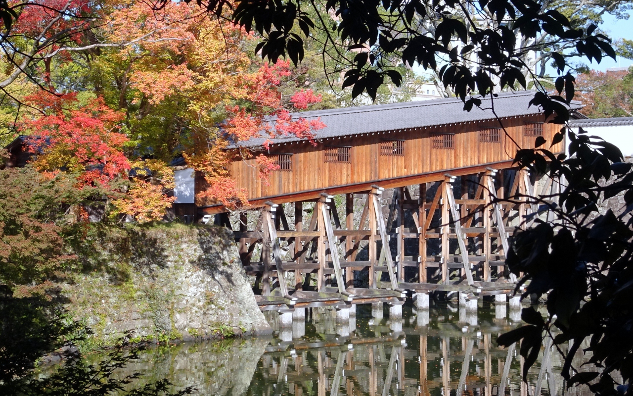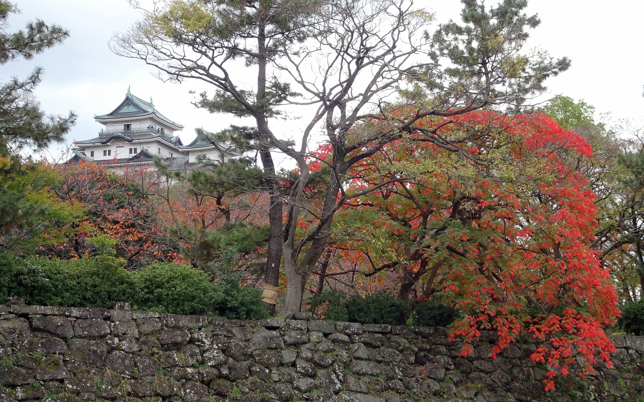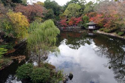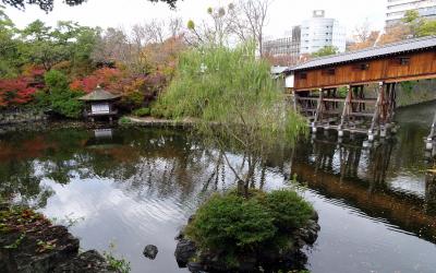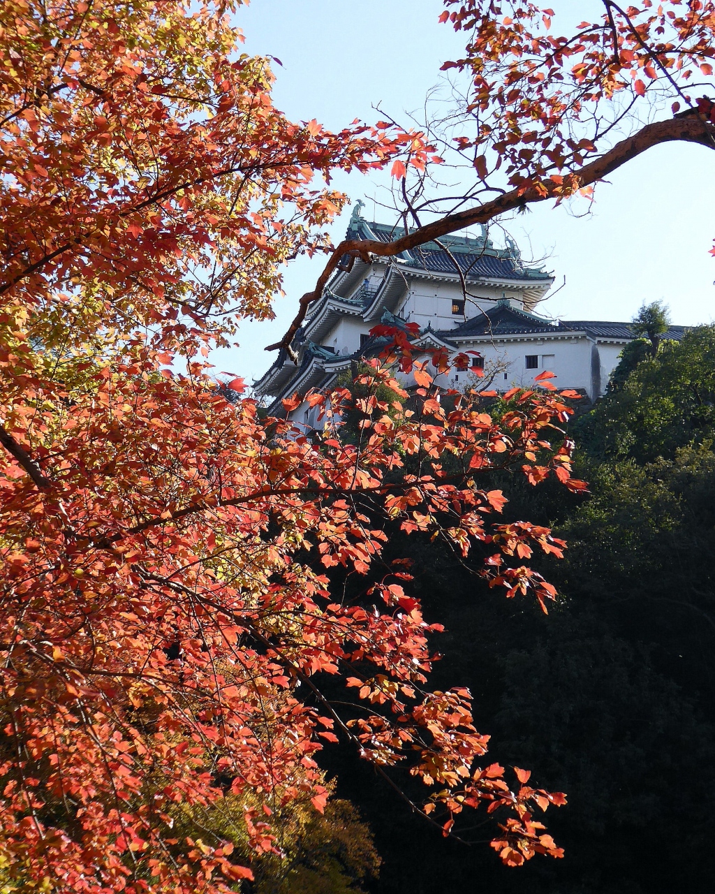 和歌山城の西之丸庭園は,通称「紅葉渓庭園」と呼ばれ,和歌山市内の紅葉の名所となっています。紀州藩初代藩主徳川頼宣が隠居所の御殿と共に築いた池泉回遊式庭園。虎伏山の斜面を利用して沢や池を作り,御橋廊下で区切られた内堀を大きな池に見立て,釣殿風の建物「鳶魚閣」や「柳島」を配置した,趣のある庭園です。紅葉に囲まれた「上の池」や内堀とそこに浮かぶ「鳶魚閣」の姿を,様々な角度から写真におさめることができました。
