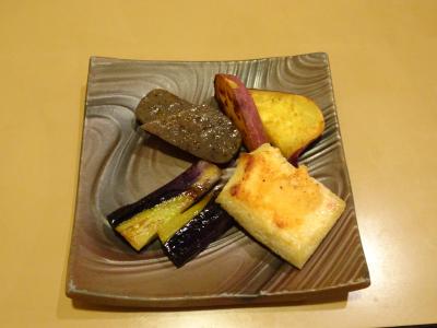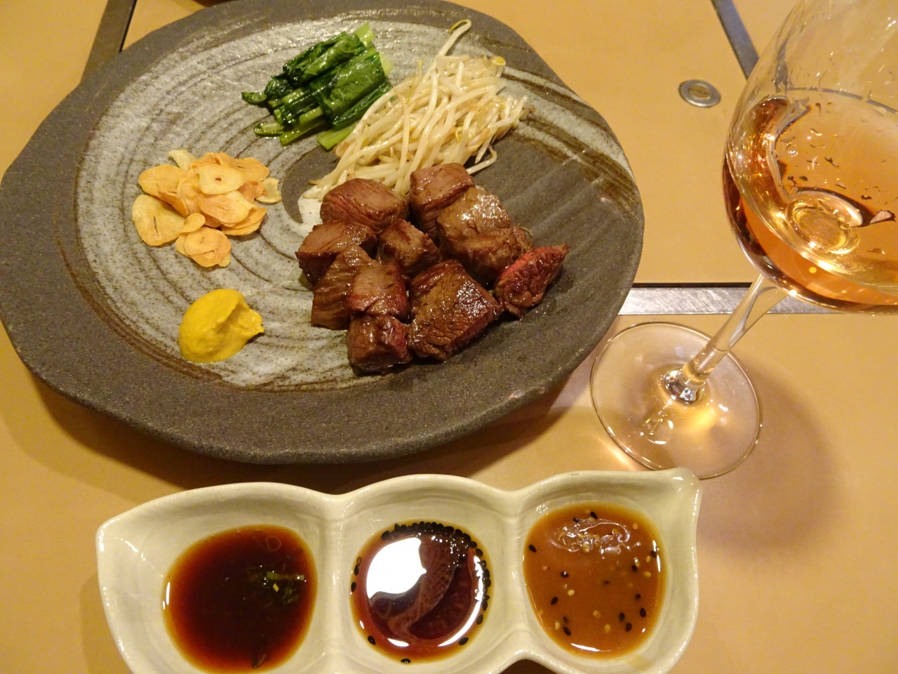 真田堀通りの中ほど。普通のテーブル席を利用しましたが,鉄板を囲むカウンター席や掘りごたつ式の個室もある。今回は,二人とも黒毛和牛のヘレステーキコースを注文(100gが3600円,150gが5400円)。付き出しとサラダに続き,焼き野菜。ステーキはサイコロ状にカットされていてお箸でいただけます。締めの御飯は,500円プラスでガーリックライスにすることもでき,最後にアイスクリームが付きます。ワインも各種そろっており,美味しいディナーでした。