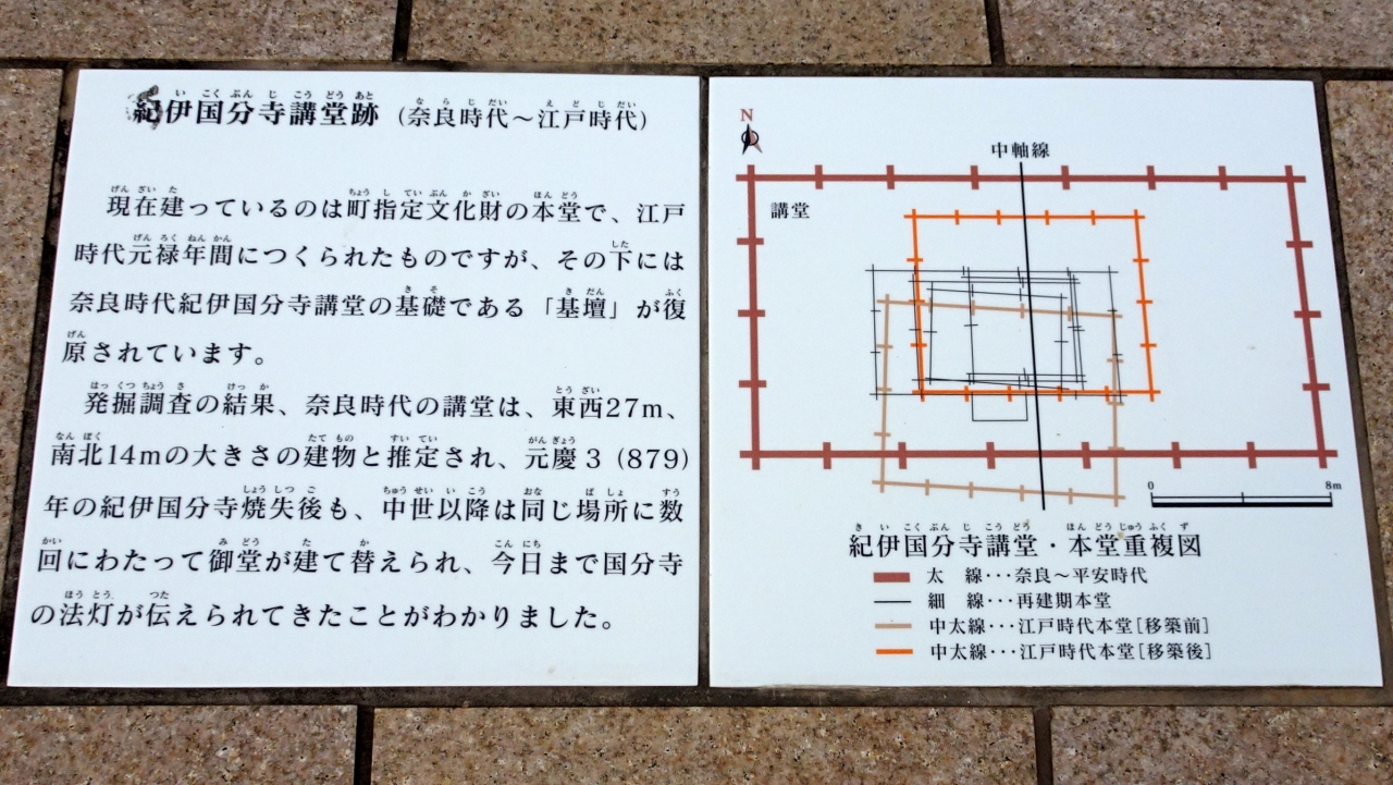 JR和歌山線の下井阪駅から北へ徒歩約12分。紀伊国分寺は,聖武天皇の詔により全国に建立された国分寺の一つで,天平勝宝8年(756年)に尼寺と共に建立されたとされています。約2町四方の敷地には,創建時の原型をそのままに遺す七重塔の塔跡などの基壇や,江戸時代に再建された本堂が修復保全されています。天平時代の壮大な伽藍の様子を想像しながら散策しました。