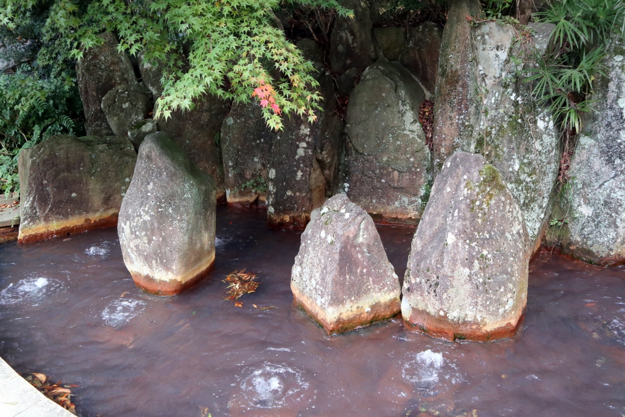 「銀の湯」から鬼瓦が並ぶタンサン坂を上った先にある寂れた公園。訪問時,そこが炭酸泉源の公園と知らずに,池の上に掛かる,ワンポイントだけ紅く色付いたもみじが絵になるなとカメラを構えて近付いたところ,池からボコボコと勢いよく音を立てて噴き出しており,寂れた中にミスマッチな感じがしました。