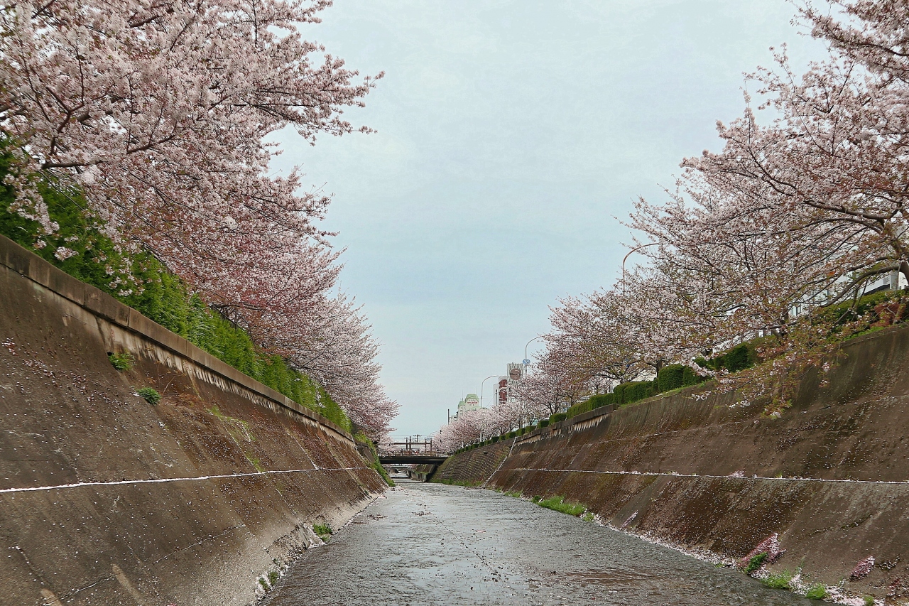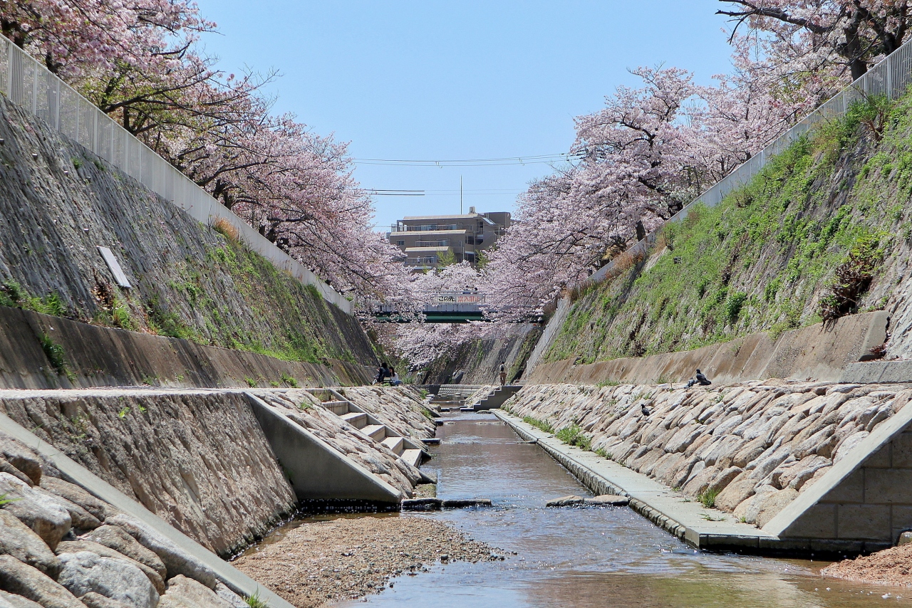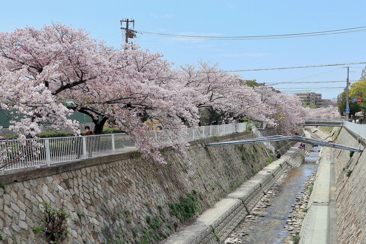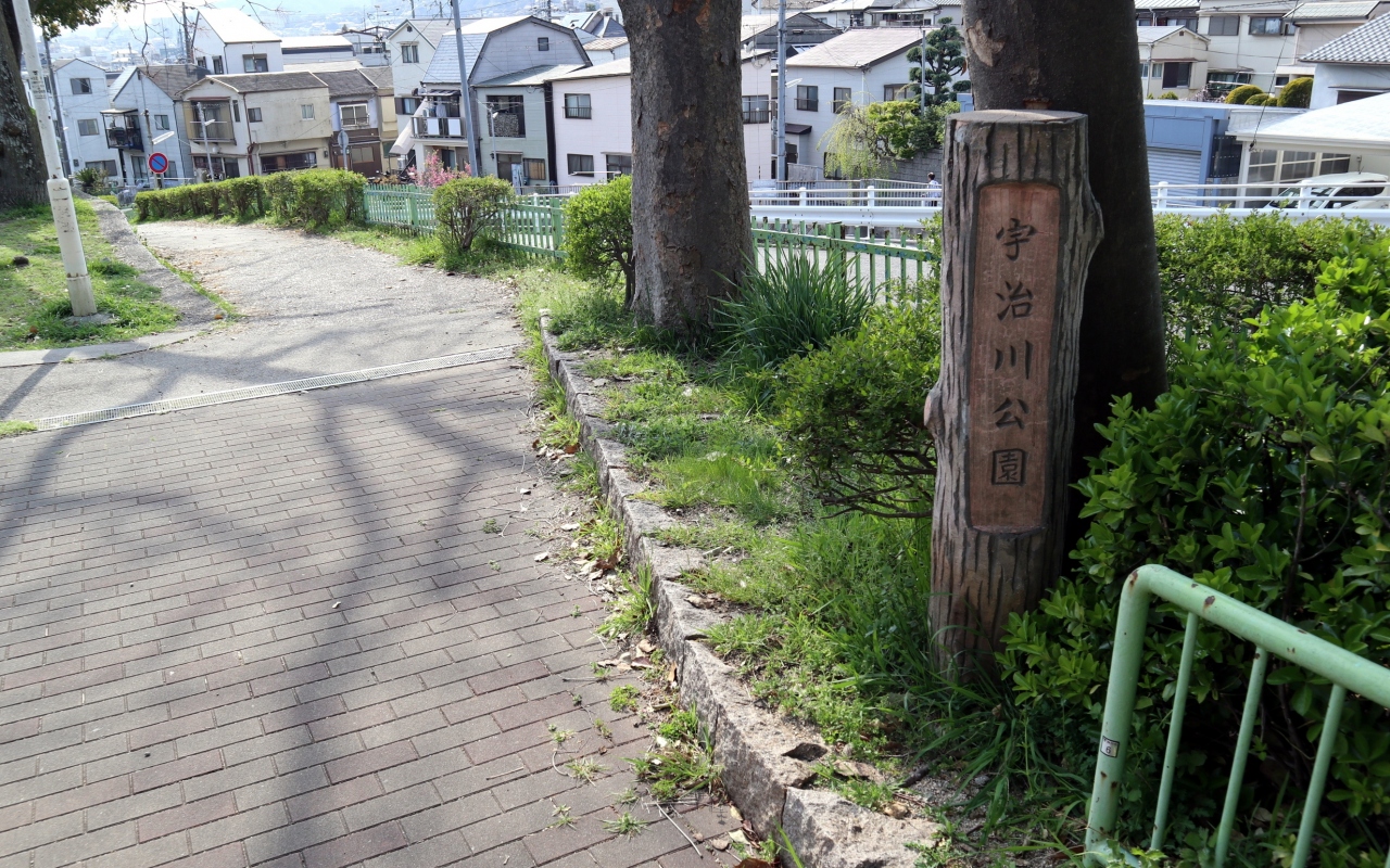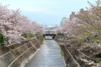 宇治川は,再度山を源に大倉山の東を流れ,ハーバーランド東側の弁天浜に注ぐ川で,山手幹線から南は暗渠になっています。この日は,コロナ禍の中,せめて地元の桜の名所を楽しもうと,地下鉄沿線の河川沿いの桜並木を3か所はしごしました。山手幹線から北側の宇治川右岸は,宇治川公園周辺まで桜並木が続きます。宇治川公園は,6300㎡くらい広さがあるようで,広場や散策路,遊具が設置されています。この辺りから北側は桜並木が左岸側に移ります。また,平野橋の北側は親水広場となっており,2018年に訪問したときは,バーベキューと花見を楽しむ人で賑わっていました。今年は,満開が少し早く,訪問時は,満開を過ぎ,散り初め。川面に散った桜の花びらが花いかだを形作っていました。