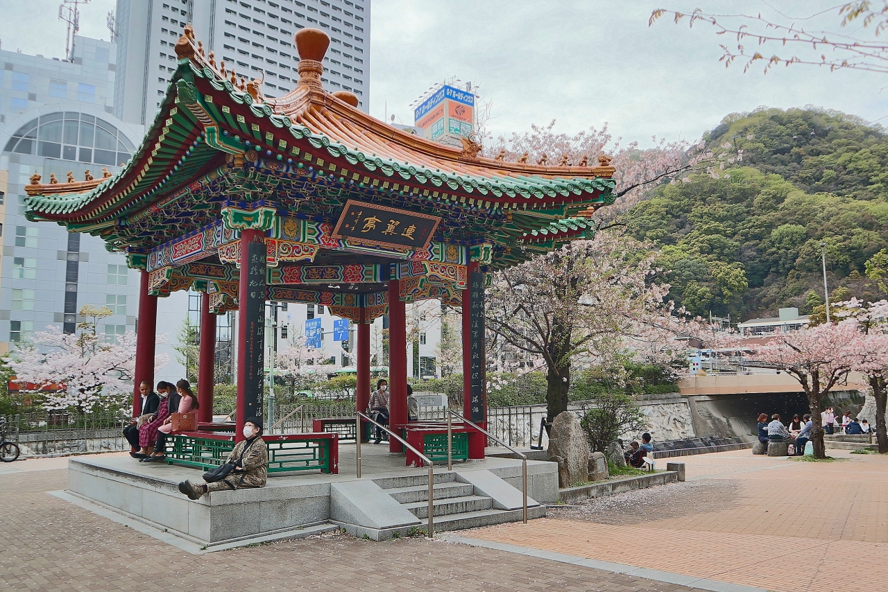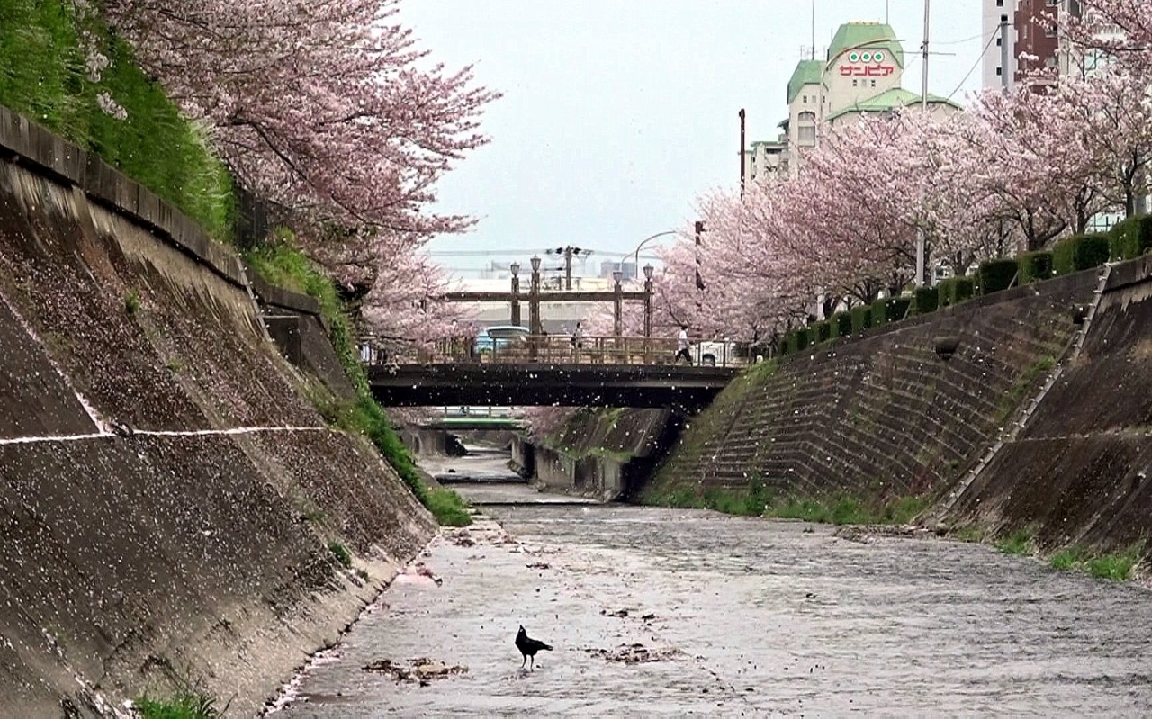 生田川は,六甲山を源とする神戸市中央区を流れる川で,昔は加納町からフラワーロードの方に流れていたが,氾濫することが多く,明治4年に現在の場所に付け替えられました。生田川公園は,新神戸駅の南から西国街道周辺まで,南北約1.6kmにわたる公園で,「連翼亭」や広場,各種のモニュメント,遊具が設置され,生田川沿に約150本の桜並木があり,「ぬのびき花街道」と呼ばれています。この日は,コロナ禍の中,せめて地元の桜の名所を楽しもうと,地下鉄沿線の河川沿いの桜並木を3か所はしごしましたが,公園では,少人数単位の花見客が,距離を保ちつつ,花見を楽しんでいました。訪問時は,散り初めから葉桜の段階に移り,舞い散る桜が花吹雪となり,川面を歩くカラスも,花を見上げて戯れているようでした。