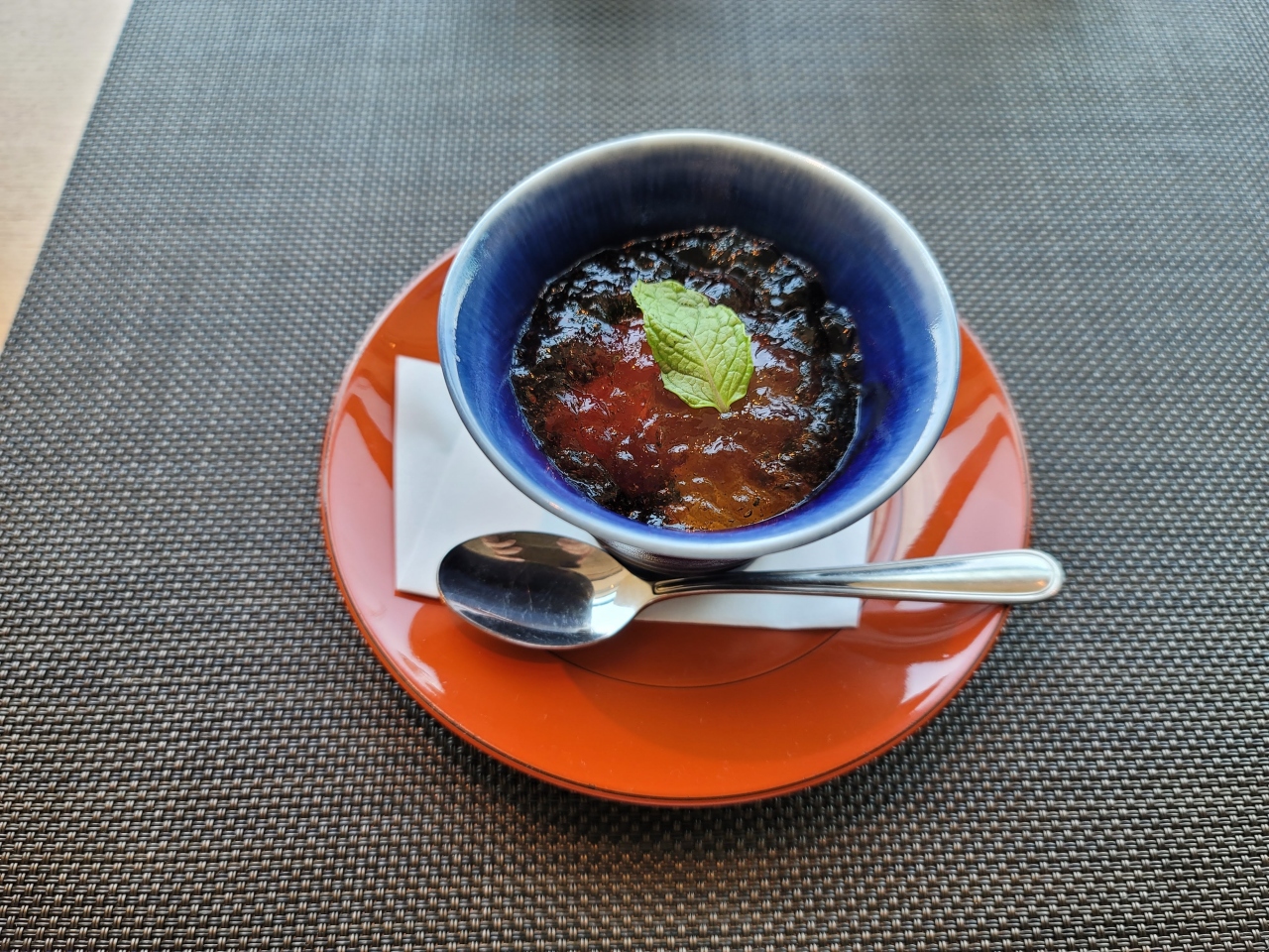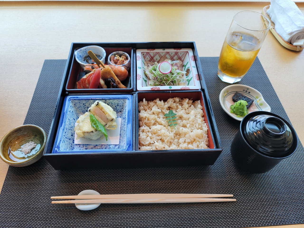新型コロナワクチン接種のため,グランキューブ大阪(大阪国際会議場)を訪れましたが,午後一番の予約時間であったので,隣のリーガロイヤルホテルでランチしようと,このお店をオンライン予約。大阪駅からシャトルバスを利用するのが便利。「All Time Lunch」として,ホテルの各レストランで3,000円のランチが用意され,新型コロナワクチン接種券の提示で10%オフとなる特典あり。このお店のランチは,松花堂弁当。先付にトウモロコシを使った胡麻豆腐がセットされ,鯛めしを主菜とし,サラダ仕立てのマグロのお造り,茄子と海老の揚げ物,魚の焼きものが適量盛られた弁当。デザートはフルーツの紅茶ゼリー寄せ。リーズナブルではありませんが,地上30階の眺望を楽しみながら,ゆっくりと美味しいランチを楽しみました。