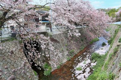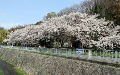 妙法寺川は、神戸市北区から須磨区妙法寺を経由して,神戸三木線と並行して山陽電車板宿駅周辺に至り,須磨港まで流れる川で、川沿いの戎町,権現町,大田町,東町,戸政町にまたがって妙法寺川公園が整備されており,広場や遊具も設置されています。この日は,コロナ禍の中,せめて地元の桜の名所を楽しもうと,地下鉄沿線の河川沿いの桜並木を3か所はしごしました。妙法寺川公園には,妙法寺川の両岸に約400本の桜並木があり,約500mにわたり桜のアーチが続きます。満開となった桜が川面に覆いかぶさり,護岸整備された川端に降り立つと,青空の中に映える桜が大変見事でした。毎年4月上旬には「須磨妙法寺川さくらまつり」が開催されるのですが,今年は新型コロナウイルス感染症感染拡大防止のため中止されたようです。