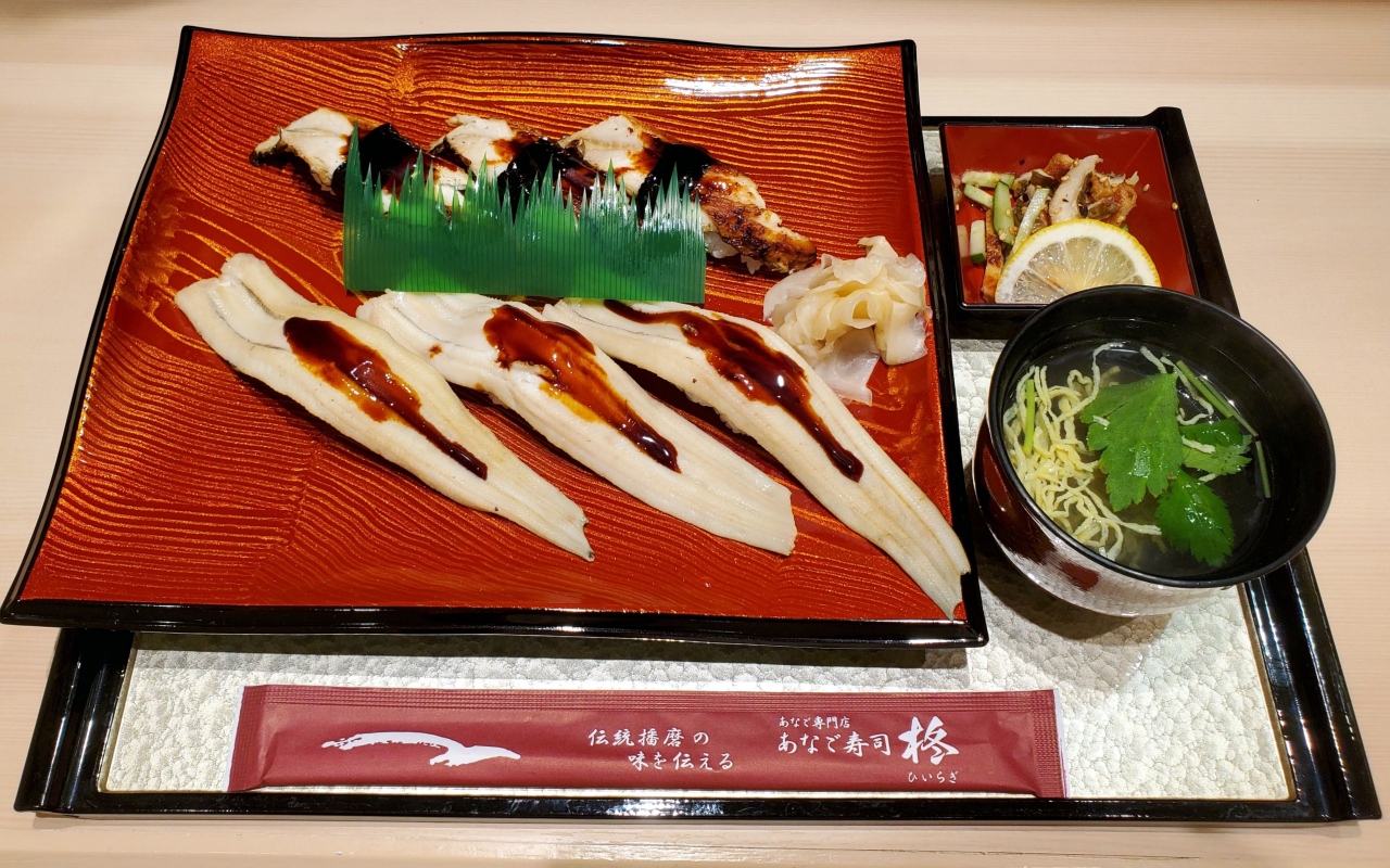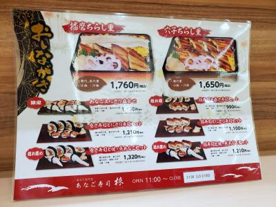 イートインメニューは,ちらし重が2種と,盛合せが6種で,いずれも小鉢と汁物が付きます。盛合せは,焼き穴子,蒸し穴子,姿蒸し穴子(いずれもにぎり寿司),押し寿司,巻き寿司を組み合わせたもの。今回は,ランチに,家内が焼き穴子のちらし重(税込1,650円)を,私があなご上にぎり盛合せ(姿蒸し穴子3貫,焼き穴子3貫。税込1,430円)をいただきました。焼き穴子は,柔らかさを保って香ばしく焼かれ,姿蒸し穴子は,ふんわり蒸された穴子を一本丸ごとを使って。いずれも穴子の旨味がよく出ていて,美味しくいただきました。小鉢は,穴子ときゅうりの和え物でした。- 旅行時期