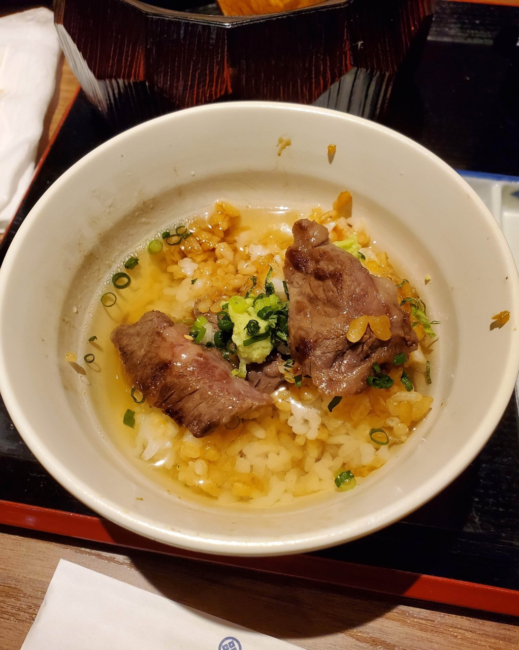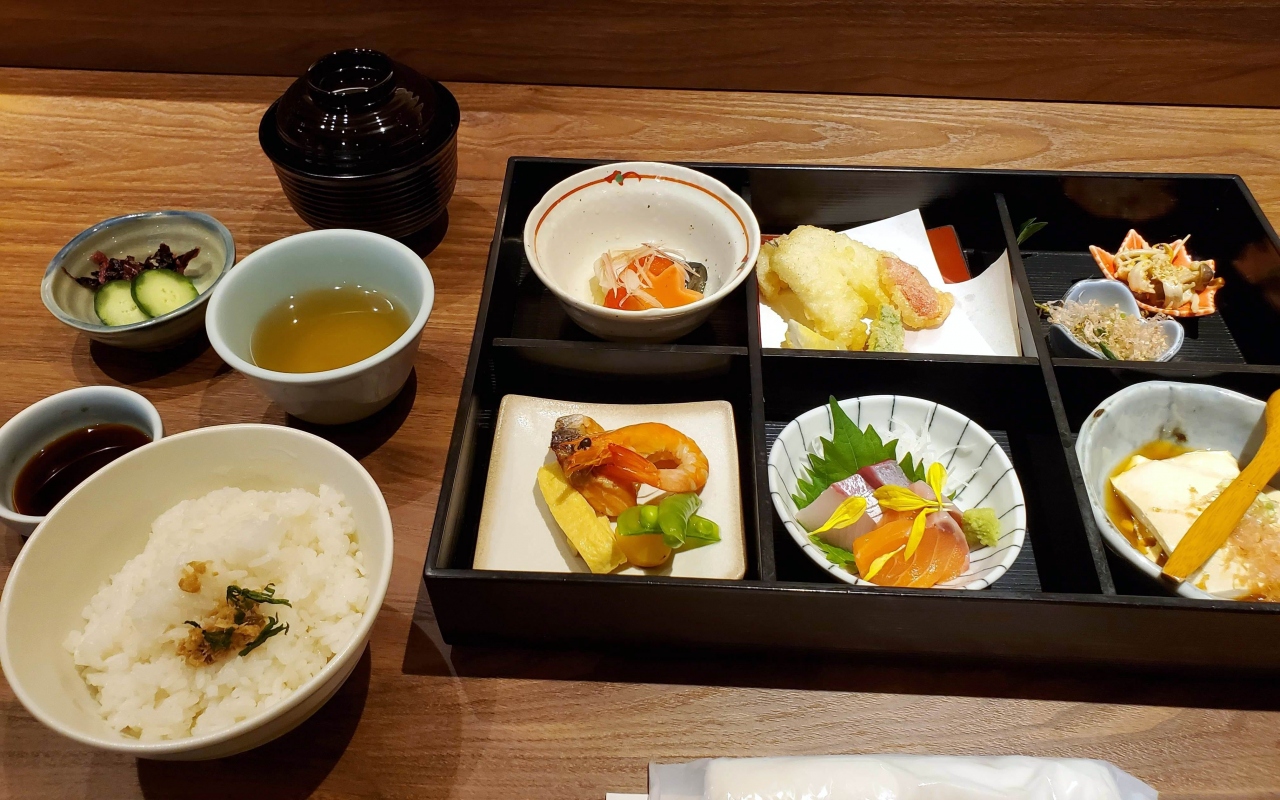 さんちか味ののれん街に8月に改装オープンしたお店で,表に出てたランチメニューの「黒毛和牛いちぼのひつまぶし」が気になっていたので,日曜日のお昼に家内と行ってみました。入口で手指消毒剤の使用を勧められ,手首の検温も。マスクを入れる袋が配布。午後1時を過ぎていましたが,結構混んでいて,カウンター席に着席。料亭風の内装がいい雰囲気。家内は「季節の六枡弁当」(税別1,800円),私はお目当ての「黒毛和牛いちぼのひつまぶし」(税別2,100円)を注文。いちぼのひつまぶしは,お肉が柔らかくてグッドですが,お肉の量がメニューの写真よりだいぶ控え目なのが残念。お味噌汁と小鉢,香の物が付きますが,ひつまぶしが少し濃いめの味付けでもあり,サラダくらいは付けて欲しいところ。出汁をかけてちょうどいい味加減に。家内の「六枡弁当」は,色彩豊かで,目でも味わえる一品。のれん街の平均単価からすると,ちょっとお高めの設定でした。