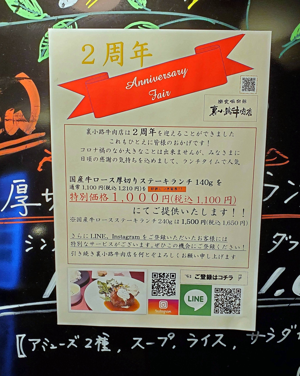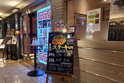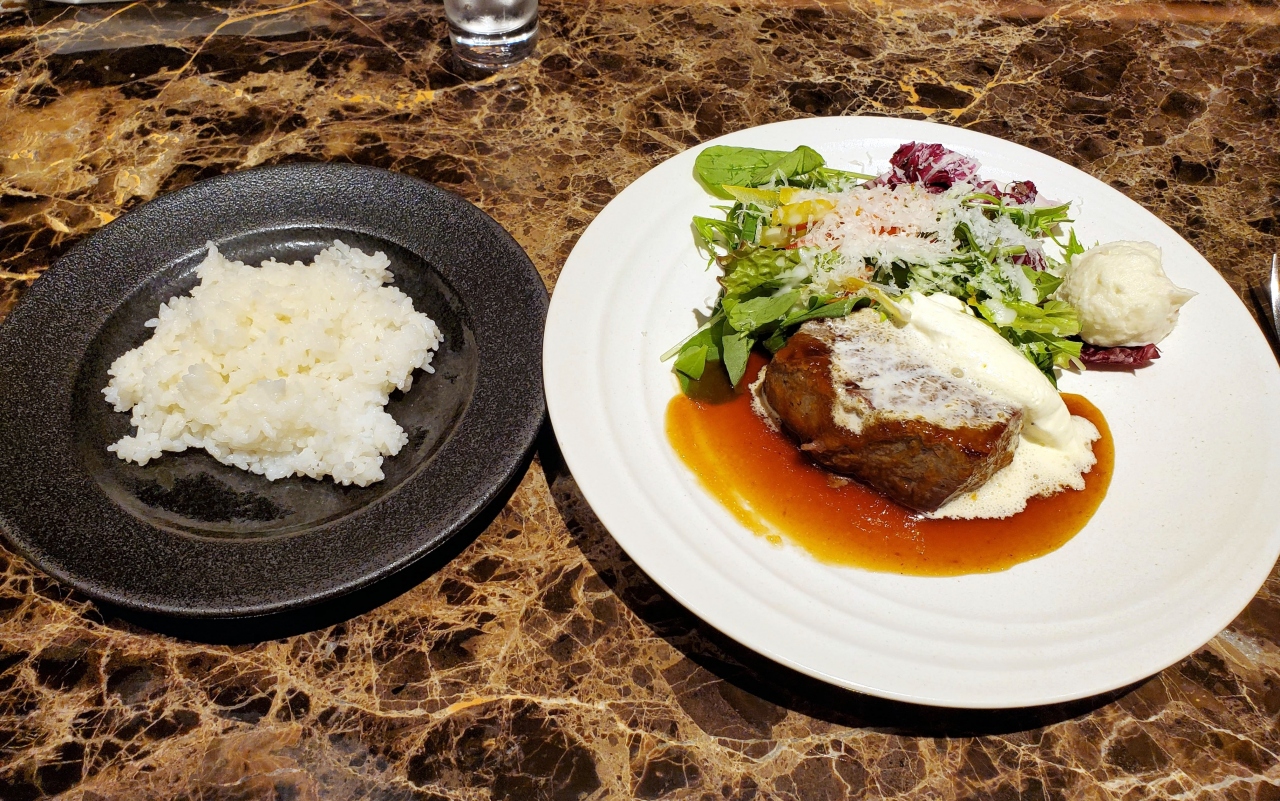 ヒルトンプラザイーストの地下,先日訪店した「たちばな」の向かい。ランチに訪店しました。通常1,100円(税別)のステーキランチ(140g)がオープン2周年を記念して1,000円で。カップスープと前菜,ライス付き。厚切り国産ロースのステーキは,和風ソースとサワークリームがよくマッチして美味。テーブル席の方は,ランチ利用のグループで賑わっていましたが,案内されたカウンター席の方は,コロナ対策のため1席開けての着席で,3人くらいだけで,ゆったりと静かに落ち着いた時間を過ごすことができました。