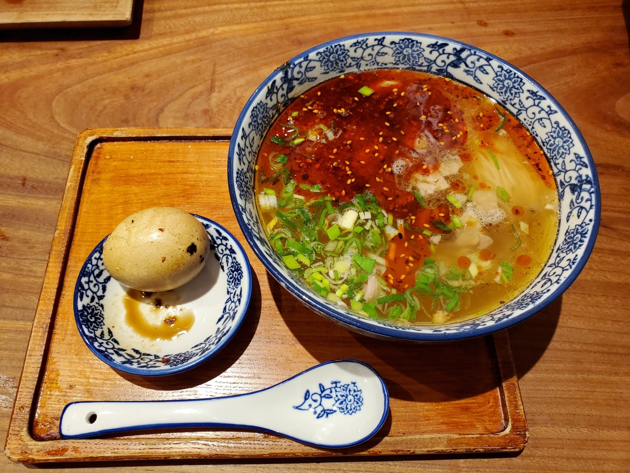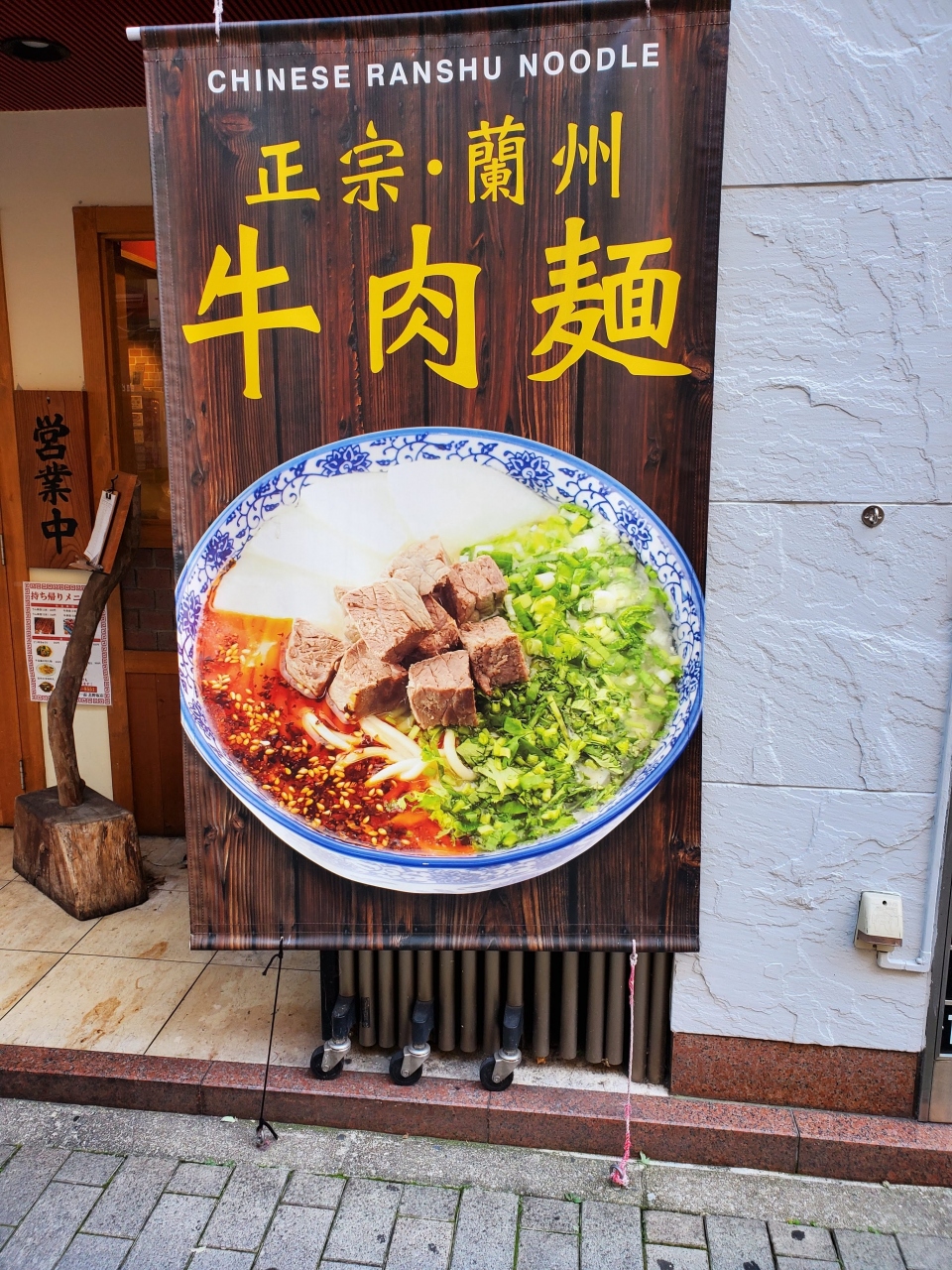 北野坂へと通じる加納町4丁目の坂道沿いにある蘭州拉麺のお店。「一清・二白・三紅・四緑・五黄」と定義される蘭州拉麺は,元町商店街のお店以来,2回目にいただく。食券を購入した上で,パクチー,葉にんにく,辣油の有無などをオーダーシートでカスタマイズするシステム。麺は,極細麺,細麺,中細麺,三角麺,細平打麺,平打麺,太平打麺の7種からチョイスする。牛肉はサイコロ状のもので増量もできる。辛いのが苦手な家内は辣油を,私はパクチーを抜いて,大根を増量していただいた。あっさりした牛肉スープが美味。茶たまごは,完茹。元町まで行かずにまた食べることができてラッキーでした。