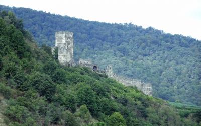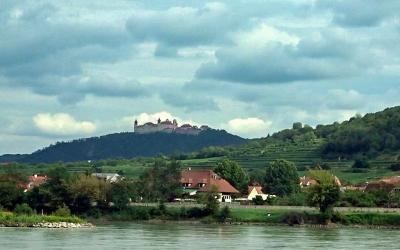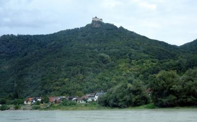 ドナウ川クルーズの船上から,高さ300メートルの山の頂上に見ることができました。Brandner Schiffahrtのリーフレットによれば,13世紀にキュンリング一族が建てたと記載されていましたが,アックスバッハのマーネゴルト3世によって12世紀初め頃に建てられたとも言われます。その後1429年にハプスブルク家のアルブレヒト5世の手に渡り,宮廷財務長官イェルク・シェック・フォン・ヴァルトに委ねられ,彼は後に盗賊騎士となり,ドナウ川を行き交う船を襲って通行料を要求し,支払われないと捕虜を城から谷底へ突き落としたとして,「恐怖のヴァルト」又は「ローゼンゲルトライン(バラ園)」の伝説で知られています。