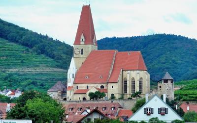 ヴァイセンキルヒェン・イン・デア・ヴァッハウにある教区教会(聖マリア被昇天教会)。教会そのものは,12世紀頃から存在していたとのことですが,1529年のオスマン帝国による第一次ウィーン包囲を契機に,1530年に住民退避用の防衛教会として城塞化されたとのこと。ドナウ川クルーズの船上から見ることができました。大きな塔の前にある白い小塔が特徴的です。