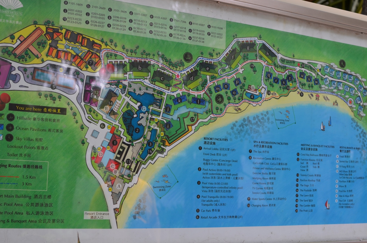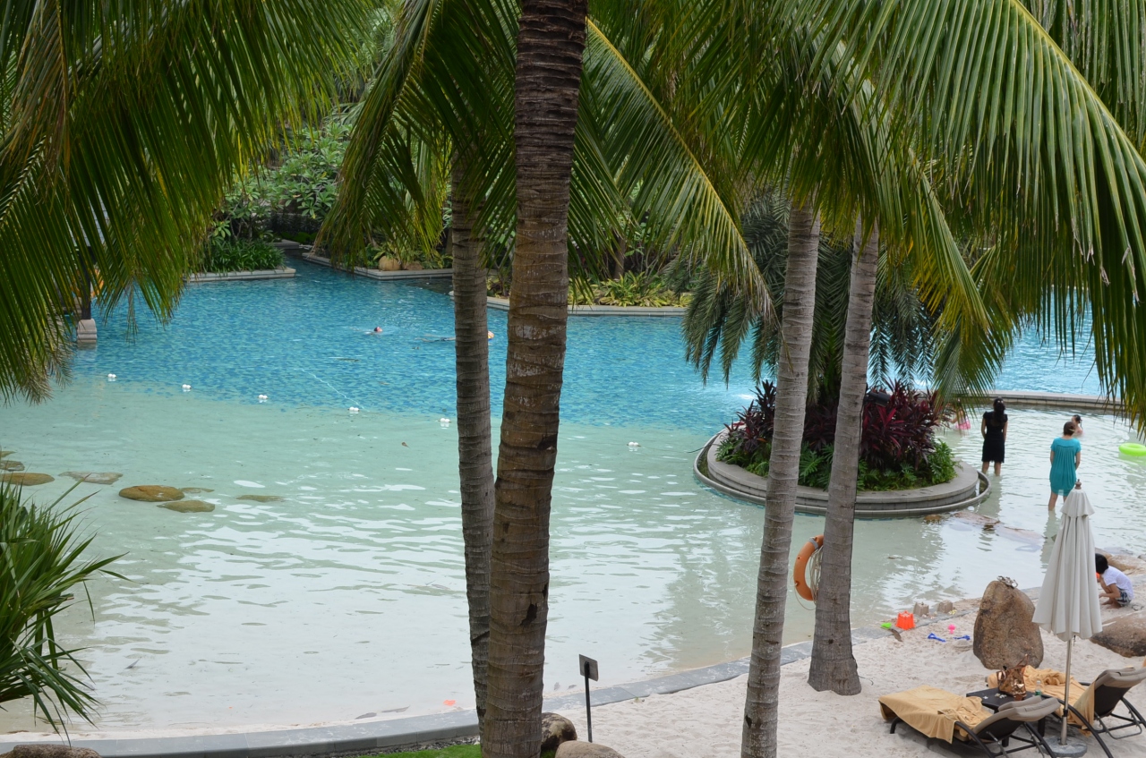 三亜でもっとも古くからある「大東海」地区の海岸から山の斜面にかけての広い敷地に宿泊棟・ヴィラ・レストランなどが点在しており、移動に電動カートが便利ですが、なかなか来てくれない時がある。歩けない距離ではないですが、暑い日中や夜間・雨降りの際、急ぐ時はちょっと大変です。