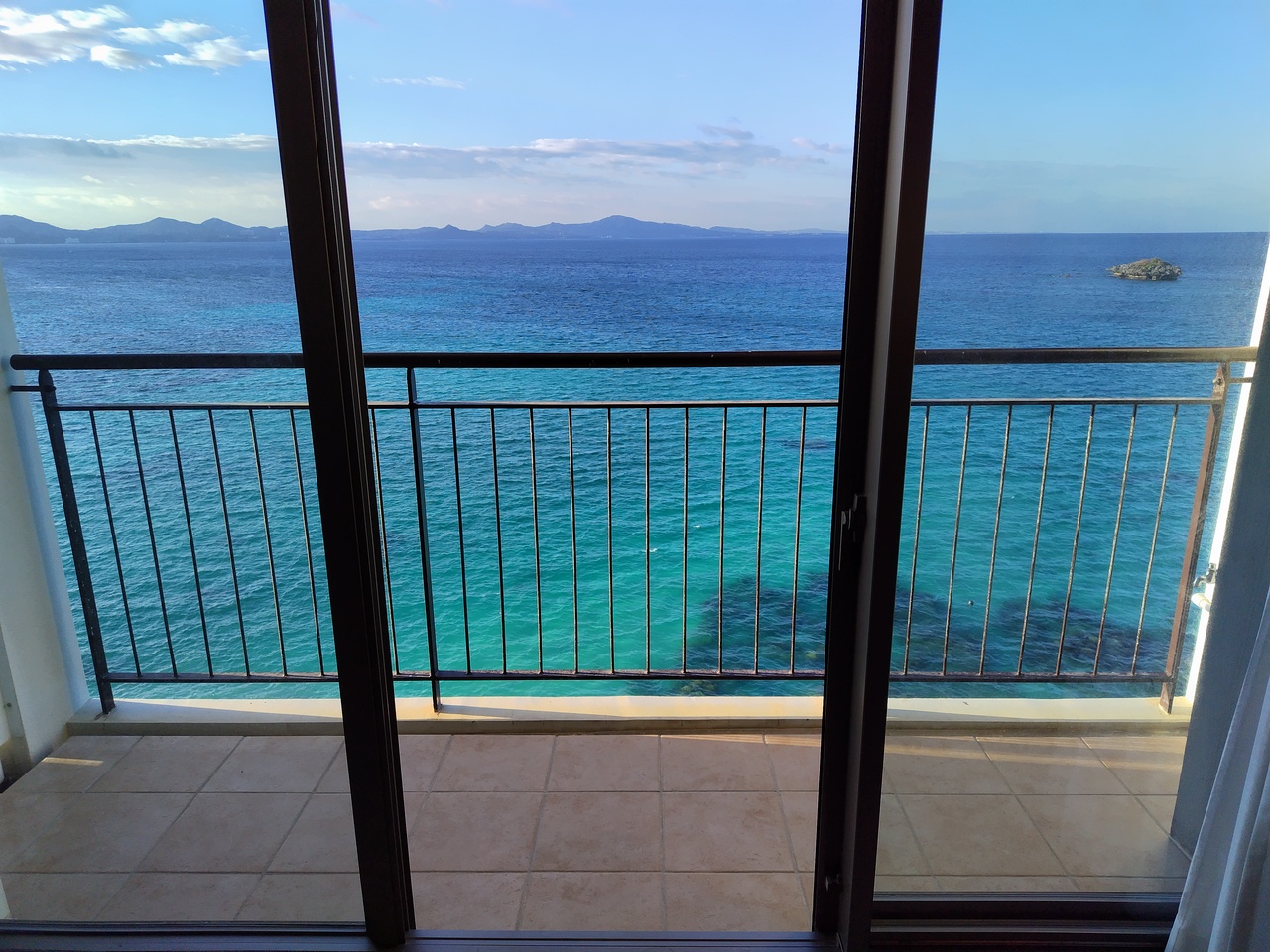 オーシャンビューで、部屋からエメラルドグリーンの海が一望できます。ベランダの下は砂浜になっており、波音も心地良いです。ホテルにはプライベートビーチもあります。部屋は広く、トイレとバスが別になっています。
