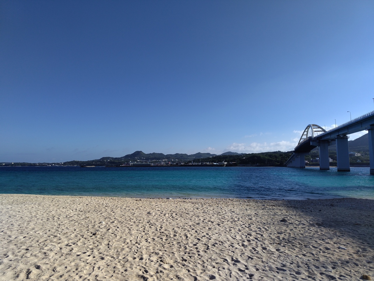 古宇利島大橋のたもとにあり、島の駅ソラハシから歩いてすぐです。白い砂浜とエメラルドグリーンの海が広がり、目の前に古宇利島大橋が伸びていて、いいロケーションです。12月でも、観光客もたくさん来ていました。