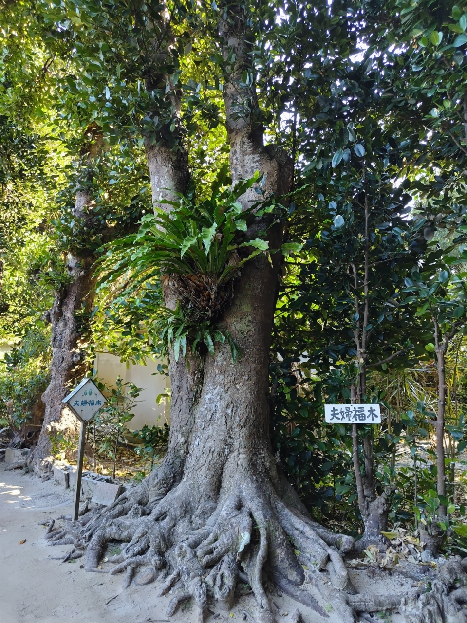 福助の玉子焼きがある無料駐車場にクルマを停めて、フクギ並木を歩いていくと数分のところにあります。フクギ並木の道沿いにあり、看板もあるのでわかりやすいです。夫婦フクギの前には、小さな小物やさんもありました。