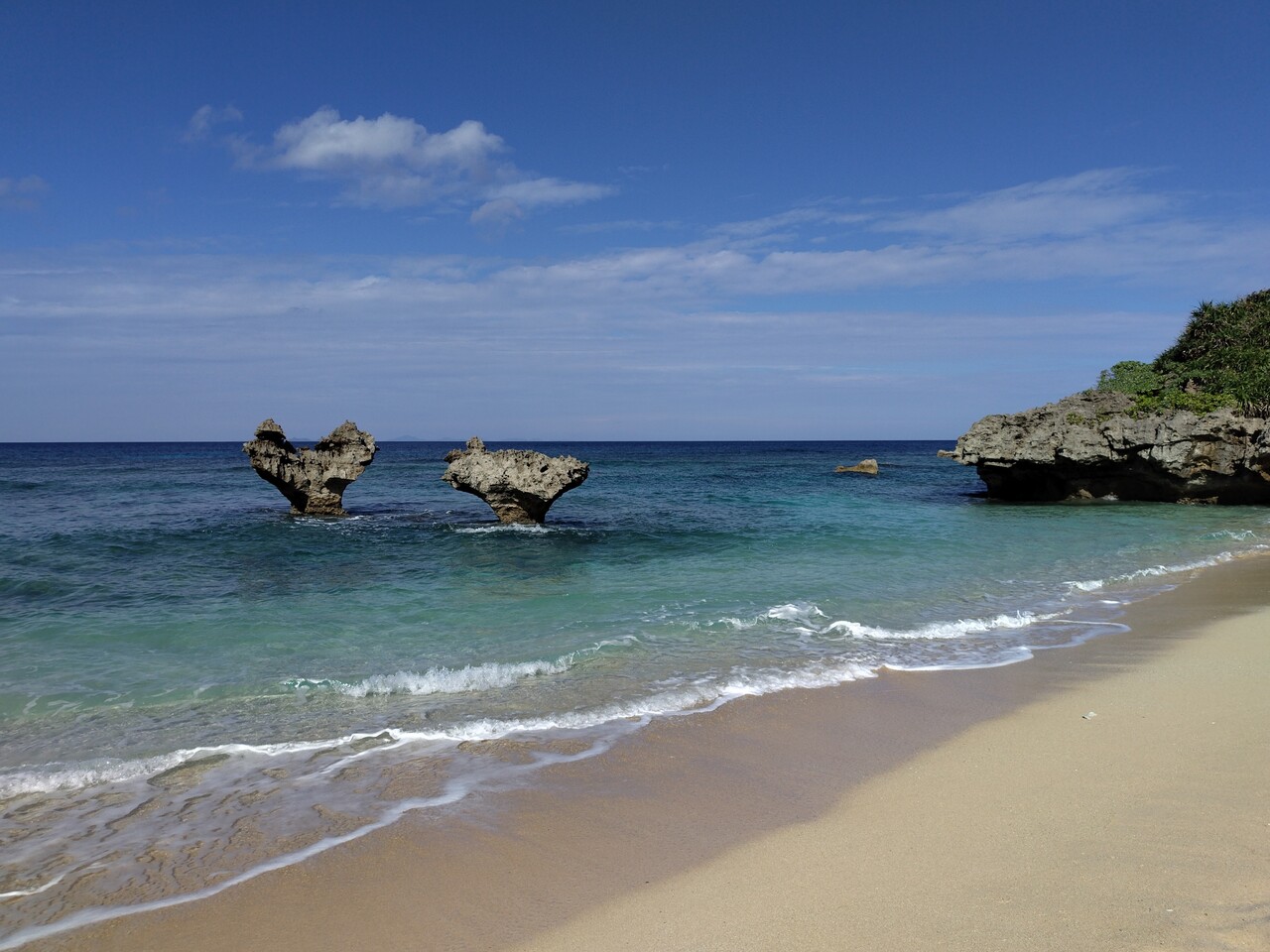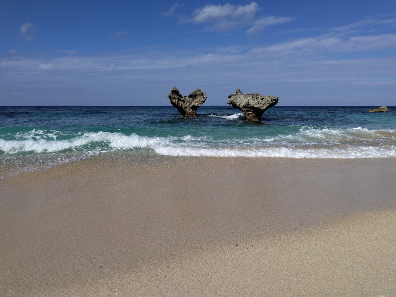 古宇利島の有名な観光スポット、ハートロックから歩いて数分のところにあります。クルマはハートロック周辺の有料(100円)に停めましたが、トケイ浜の近くには無料で数台が停められる駐車場もあります。エメラルドグリーンの海が広がり、ずっとここにいたいと思いました。