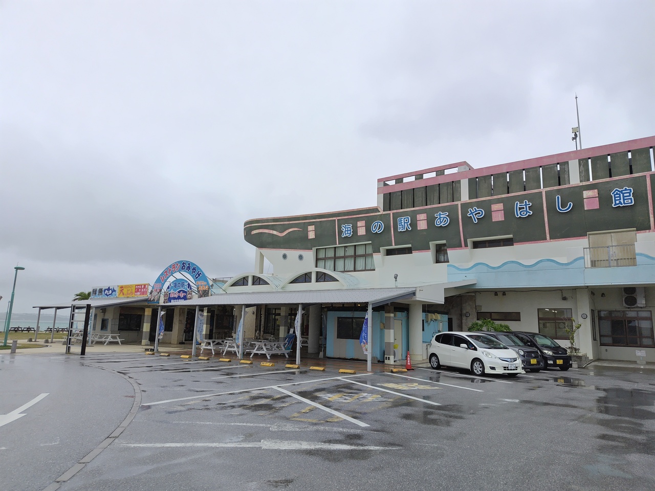 海を渡る長い橋で、途中には海の駅あやはし館があります。本島から行くと左側にありますが、どちらからでも入れて、またどちらにも出られます。また海の駅近くにはビーチもあります。行ったときは雨風が強く、クルマが風にあおられました。