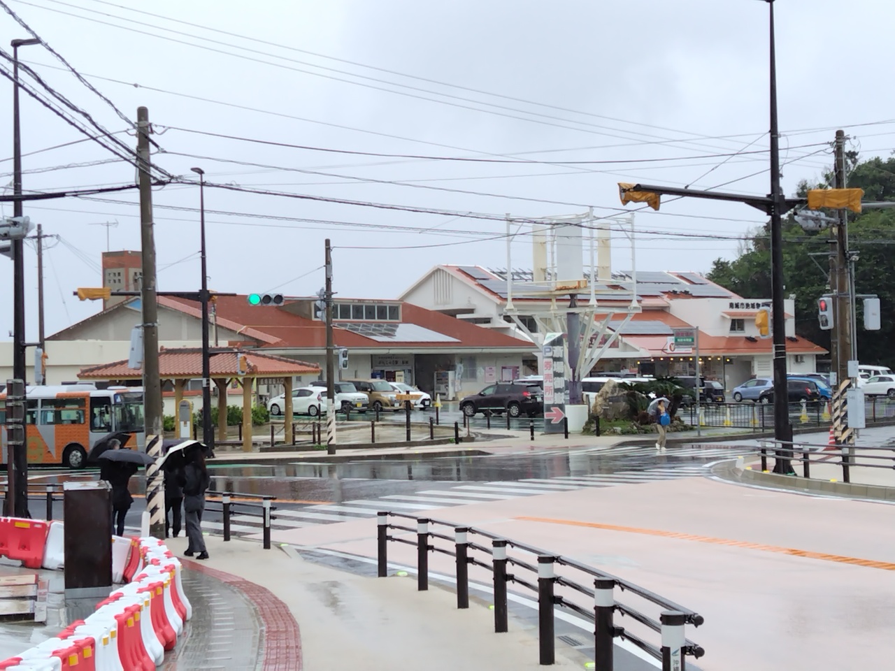 海中道路の真ん中にあります。本島から行くと左側にありますが、どちらからでも入れて、またどちらにも出られます。海の駅近くにはビーチもあり、エメラルドグリーンの海が広がっています。行ったときは、雨風が強く、浜には下りませんでした。