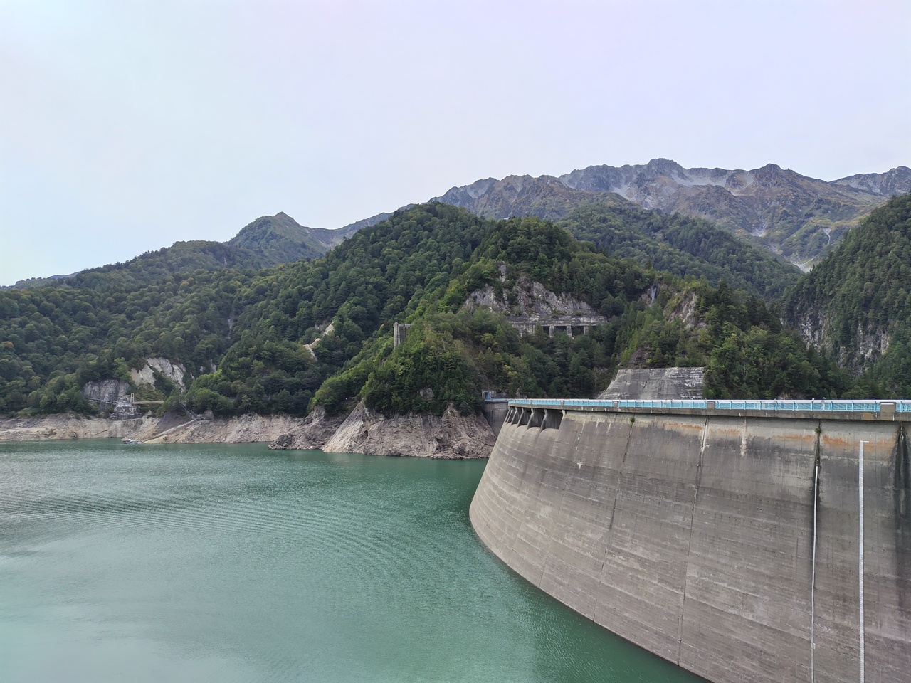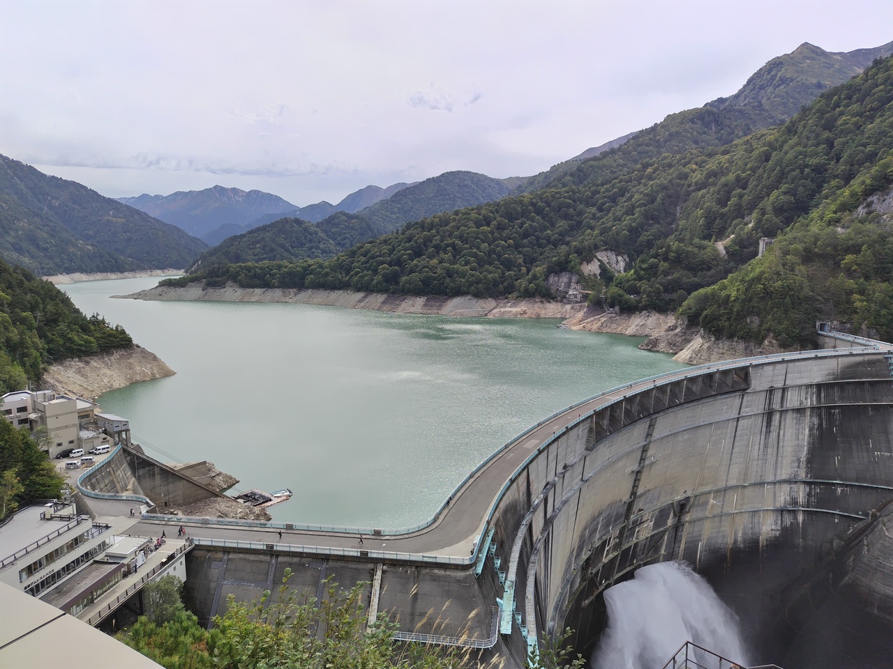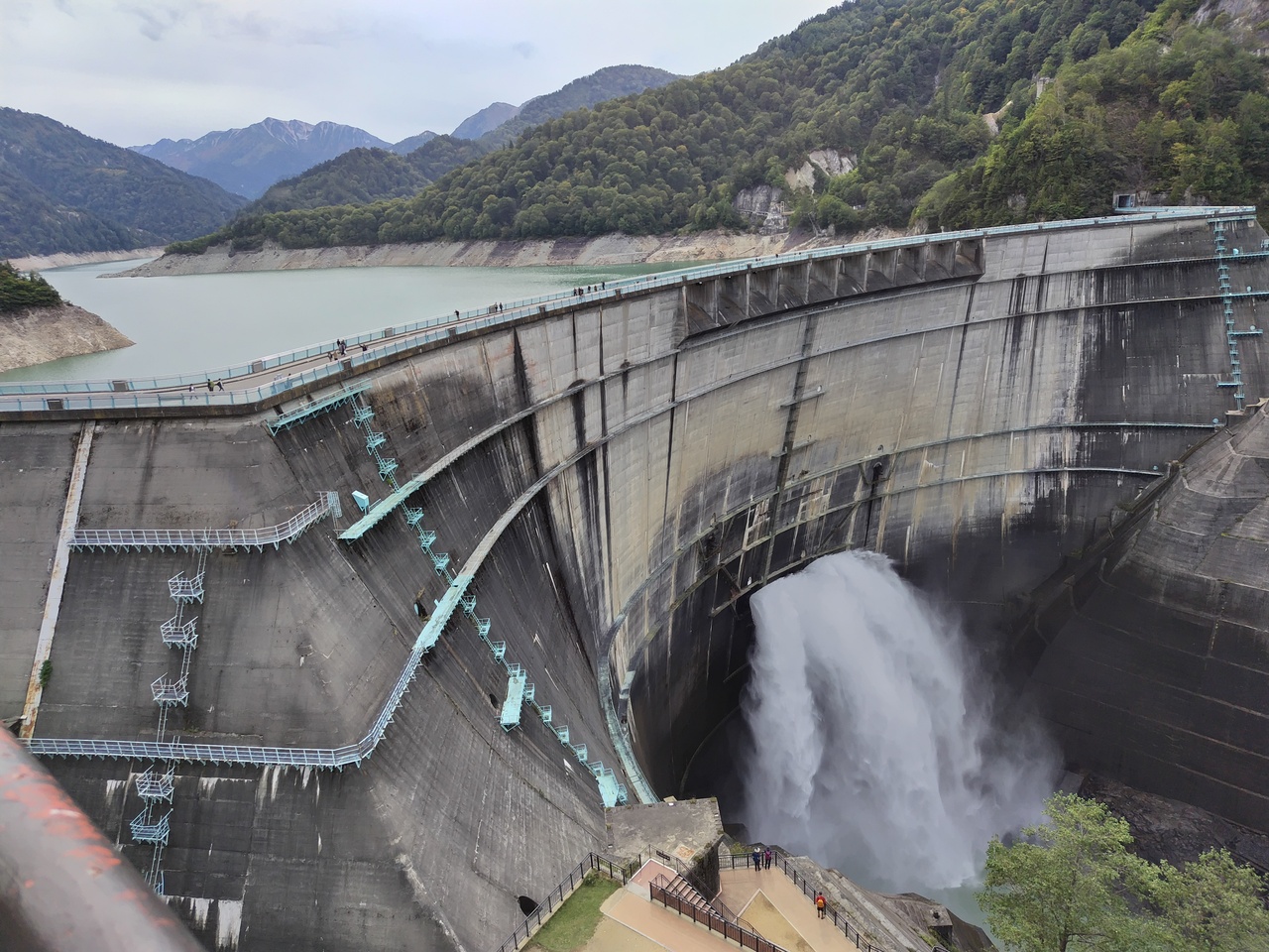 扇沢から関電トンネル電気バスで、地下の黒部ダム駅に着くと、右手の階段を登ると展望台、まっすぐ進むとダムの堰堤に出られます。展望台からは階段は下り、堰堤からはほぼ水平な道を行きます。観光放水を間近で見られます。