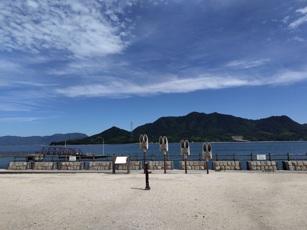 大久野島はうさぎで有名です。港を降りたらすぐにうさぎたちがいて、昼寝していたり、寄ってきたり。港から歩いていくと、ビジターセンターがあります。ビジターセンターの前には、うさぎの耳を形どったオブジェがあります。