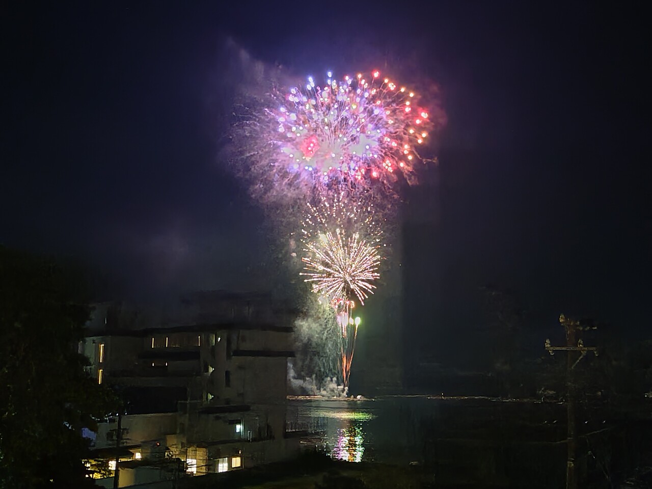 アットホームな雰囲気で、部屋からは海が見えて、居心地もよかったです。お風呂は温泉で、窓を開けると滝があって池には魚が泳いでいます。わたしが訪れたときは、宿の前で花火大会がありました。