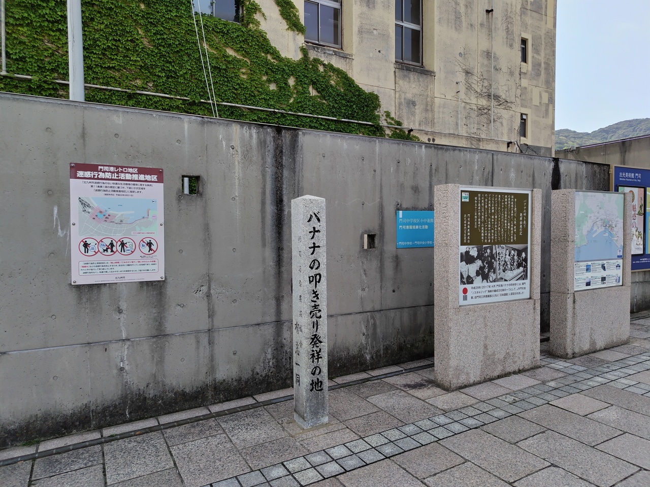 下関からレンタサイクルで行きました。関門トンネル人道は自転車も通行できます。門司港駅の前にバナナの叩き売り発祥の地の石碑と説明する看板があります。ここからも、当時の門司港の繁栄を感じることができます。