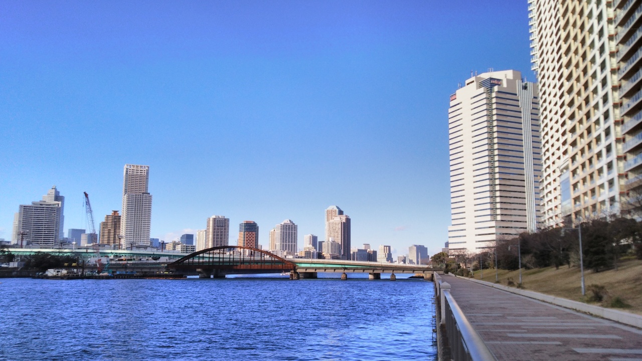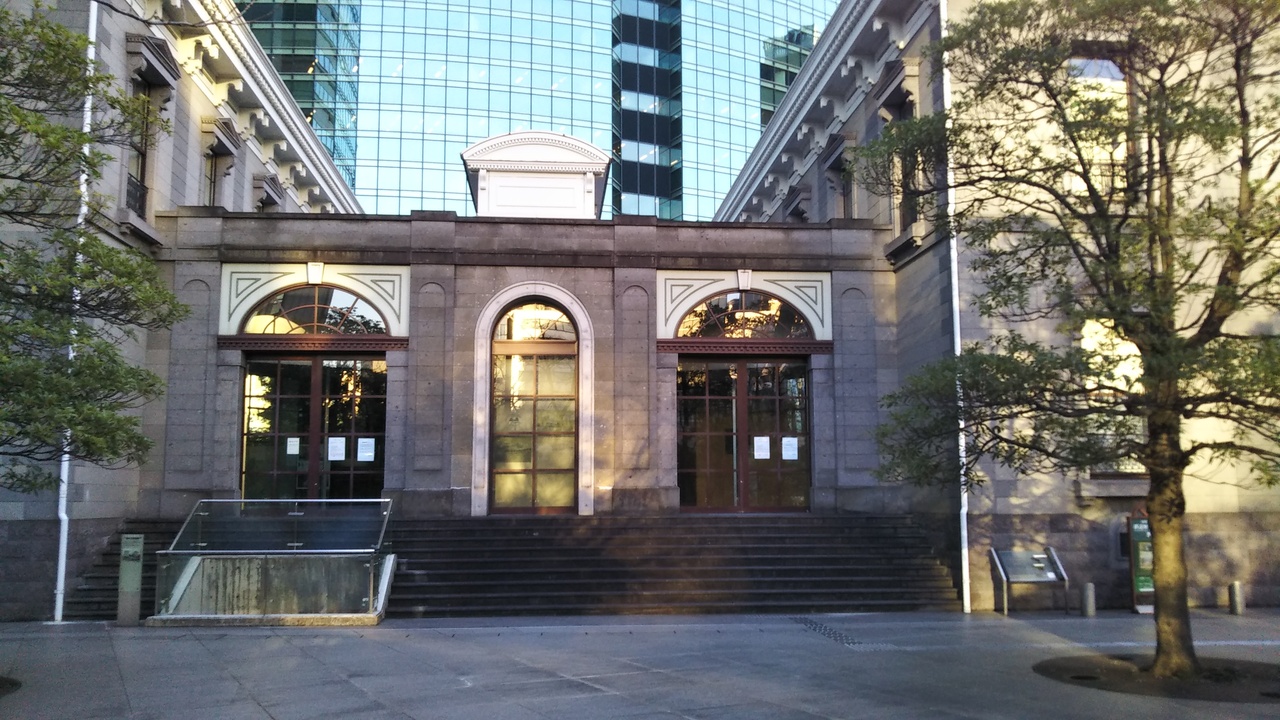 新橋駅の飲み屋街と反対側の出口から歩いてすぐのところにあります。パナソニックの本社ビルに囲まれた一画にあり、ガラス張りの高層ビルに囲まれています。近くの電通本社そばには築地に向かう貨物船跡の踏切もあります。