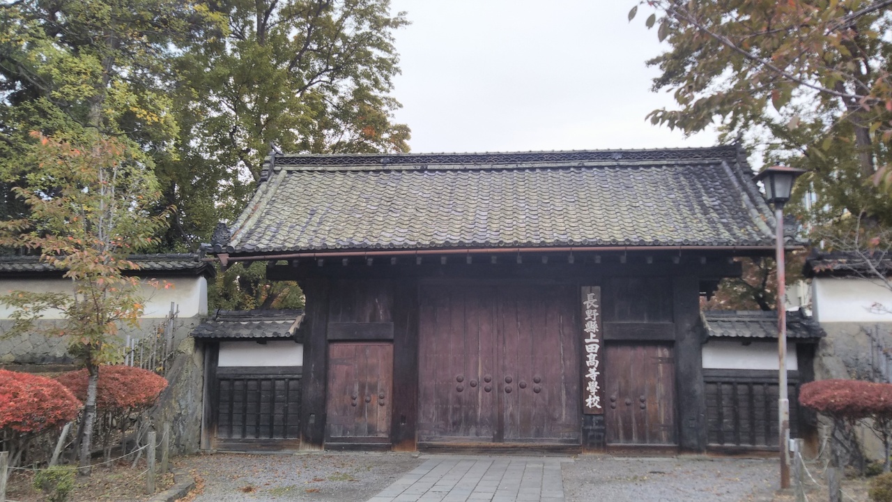 上田城を散策して上田駅に戻るとき、たまたまここを通りました。市役所から脇道に入り、高校があるなと思っていたら立派な門が。とても高校の門とは思えない由緒ありそうな門だと思ったら文化財に指定されていました。