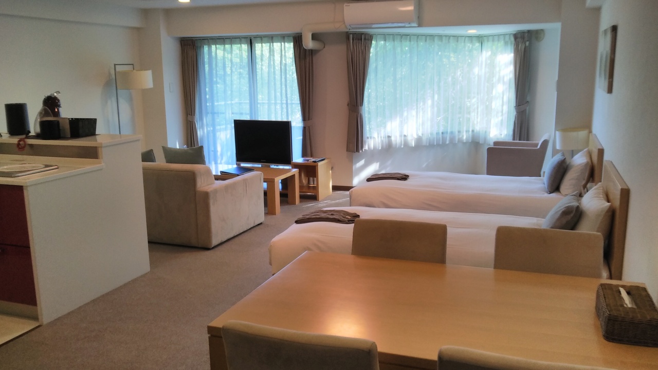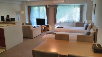 部屋の広さが規格外に広いです。フツーのマンションくらいあり、部屋を仕切る壁がないのでとても広く感じます。部屋にあるソファーの座り心地もいいです。キッチンには食器や調理器具も揃っています。お風呂も温泉で広いです。
