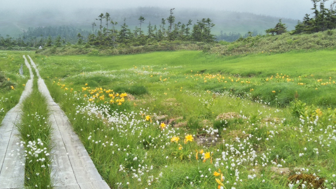 八幡平は秋田県と岩手県の県境にあり、湿原が広がりトレッキングするのにとてもいいです。遊歩道は整備されていて急なアップダウンもありません。高山植物は大沼に多く群生しており、景色も大沼を周る外周がいいです。