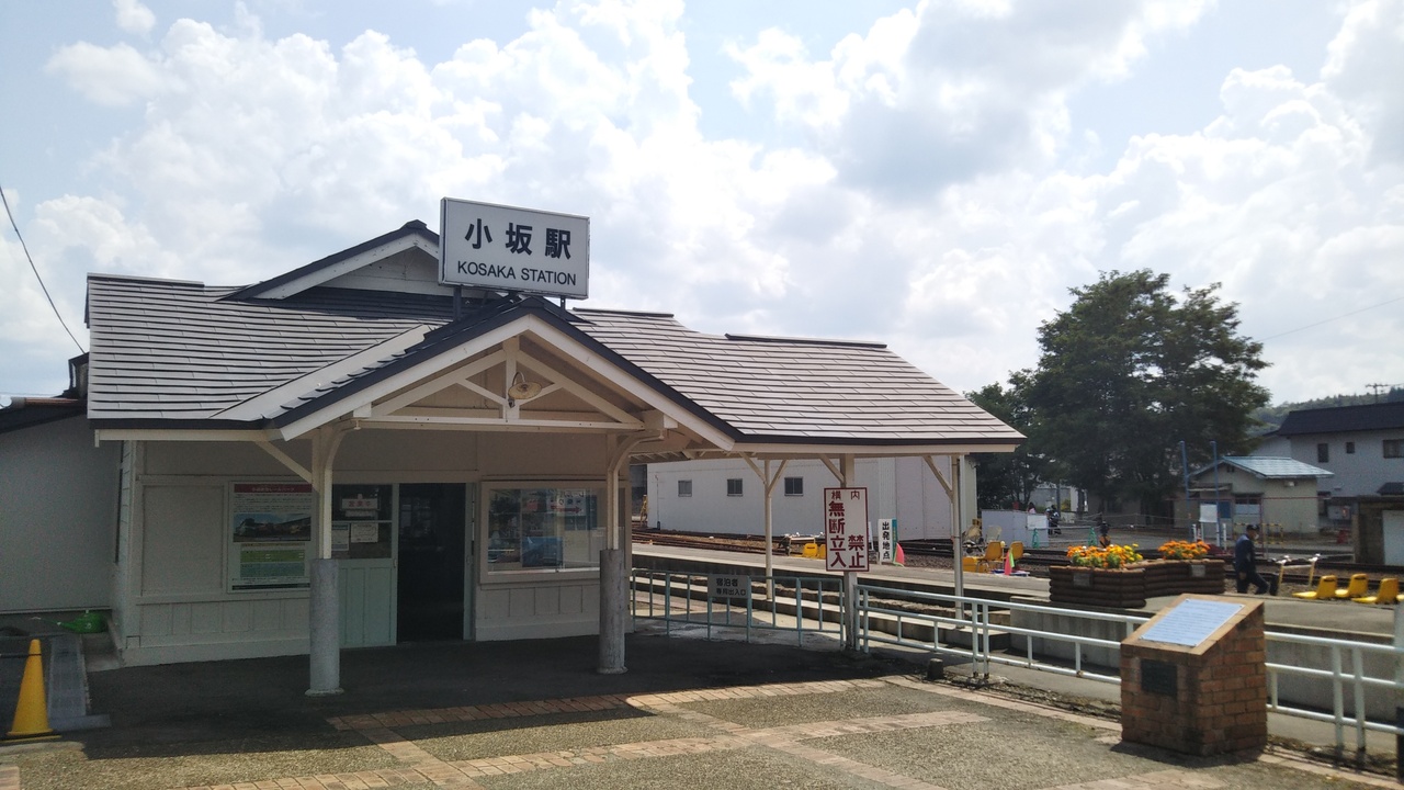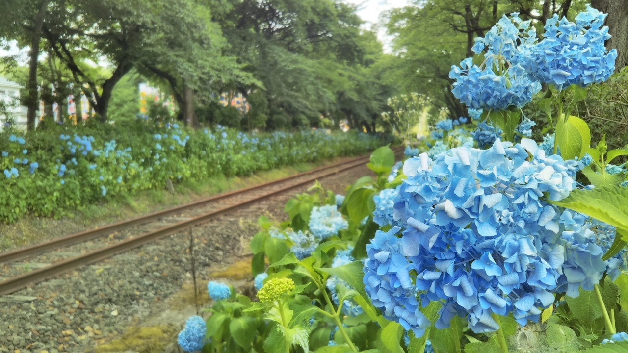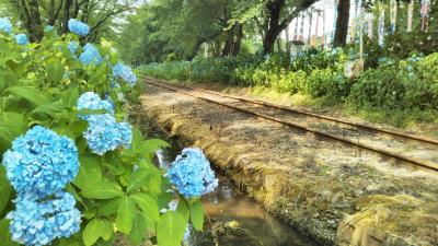 旧小坂駅で構内に車両などがあります。寝台列車以外はとくに観るものも無く、入場料を払ってまでは…。小坂レールパークから明治百年通り沿いに小坂鉄道の廃線跡があります。整備されアジサイがきれいに咲いていました。