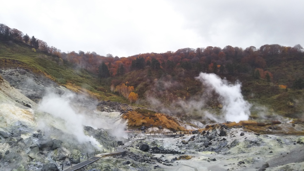 訪れましたときは天気が雨でしたが、紅葉のピークでとてもきれいでした。玉川温泉には遊歩道があり、屋外の岩盤浴ができる小屋も遊歩道沿いにあります。この遊歩道のところだけは周りの紅葉とは別世界でお湯が湧き、岩肌から蒸気が吹き出しています。