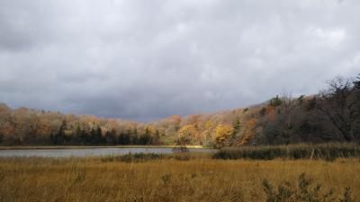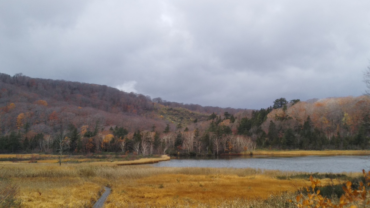 アスピーテラインの秋田県側にある八幡平ビジターセンター前に広がる沼で、眺めがいいです。ビジターセンターには駐車場があり、そこから散策路があります。天気が悪かったのですが、この季節は草紅葉がきれいでした。
