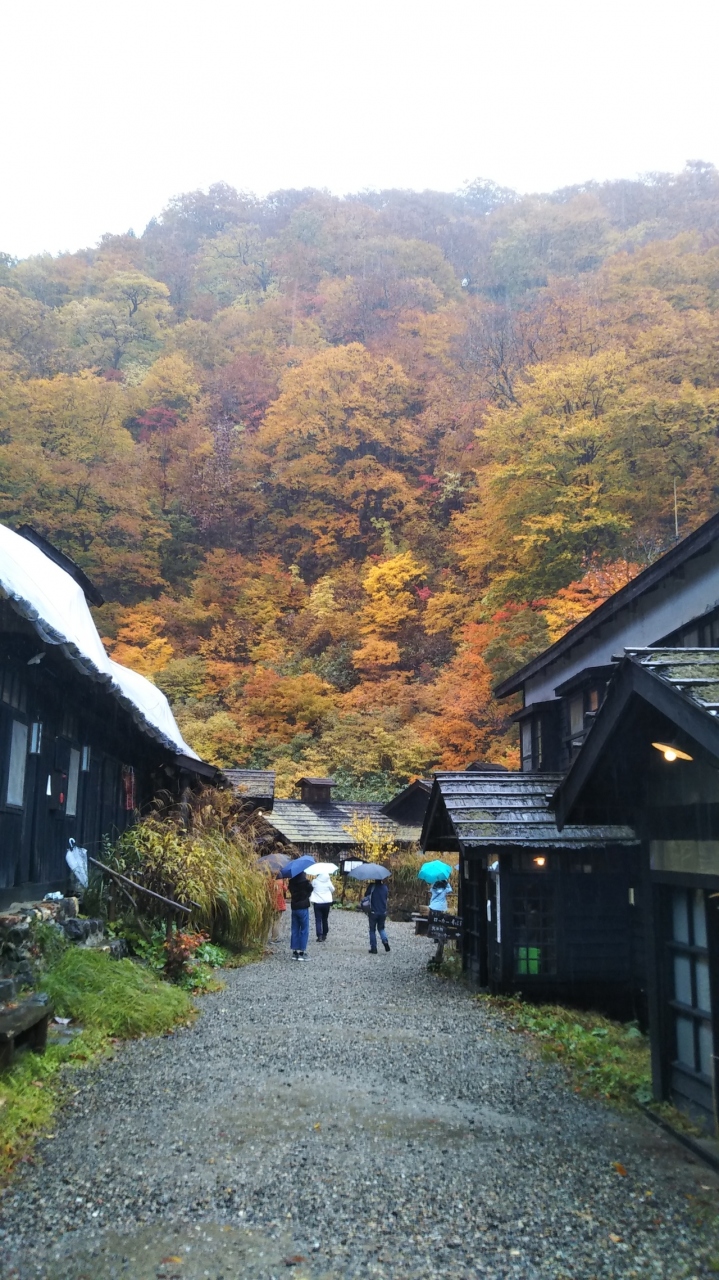 周りのの山々がブナの森の紅葉でとてもきれいでした。また温泉の建物もとても趣があります。雨でしたが、鶴の湯の露天風呂に入りました。露天風呂は人が通る通路の脇にあります。思ったより小さかったです。観光客もたくさんいました。いいお湯です。