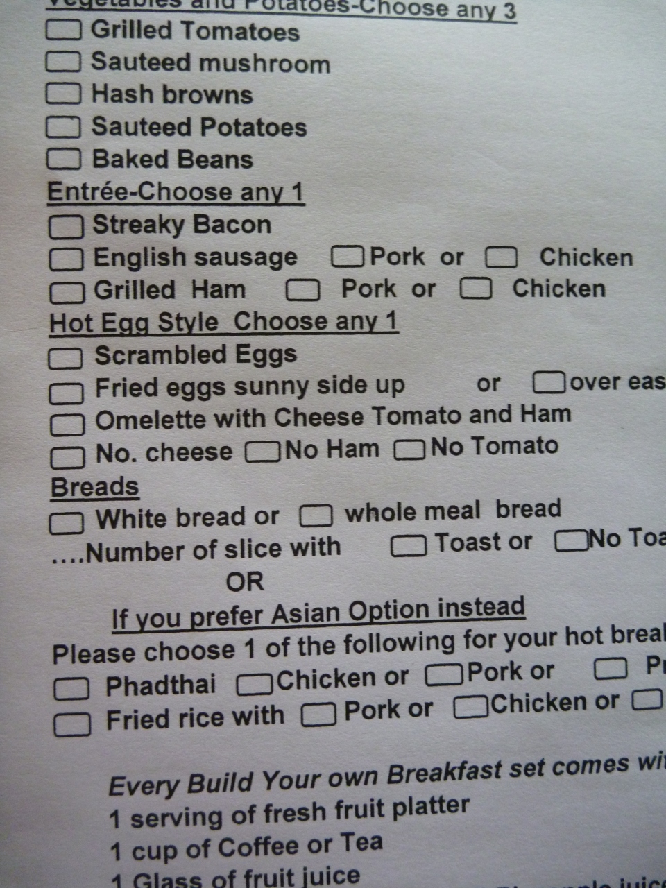 朝食がビュッフェ形式になっていると思っていたので初日は戸惑いました。注文用紙に書き込むと5分ほどでアツアツの料理が運ばれてきます。タイ料理は2種類しかないのが難点ですがカオ・パットは今までで1番おいしかったです。(毎日5分ほどで出てきたのである意味驚きでした。)