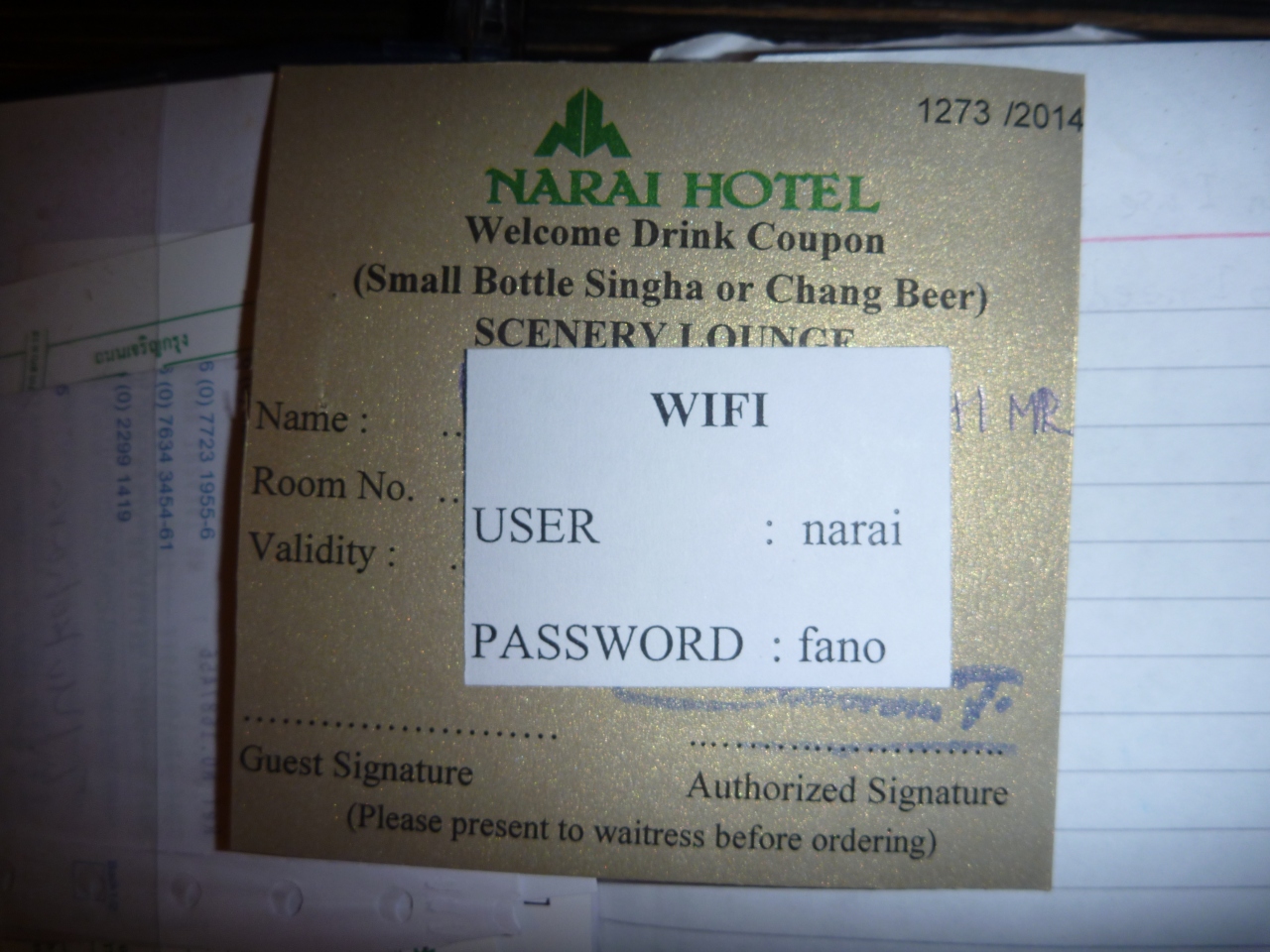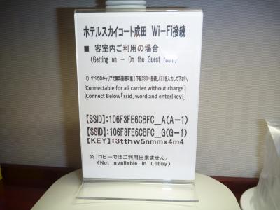 WiFiに関してはチェックイン時にIDとパスワードを記入したカードを渡されますので、ブラウザーを立ち上げた後はNarai_FL**(**は利用階数。私は11回でしたので、FL11)を選択して、これらを入力するだけで無料で利用できます。通信速度に関しては不満は有りませんでしたが、有線が利用できればとケーブルを準備をしていたのですが、有線の設備がありませんでしたのでちょっとがっかりしました。
