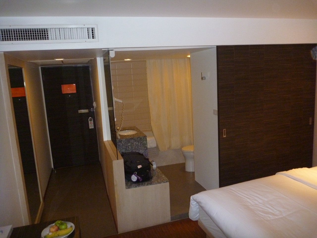 ルームキーでドアを開けて部屋に入り「省エネスイッチ」という鍵穴に差し込んでひねると部屋の電源が入るという一昔前のビジネスホテルのシステムです。カードキー等のスマートな形態ではなく、外出のたびにフロントへ鍵を預けることになります。部屋は標準的なビジネスホテルより少々狭い感じがします。トランクを開けるときにビジネスホテルでよく見かける折り畳み式の台はありませんので、床で広げるしかありませんでした。