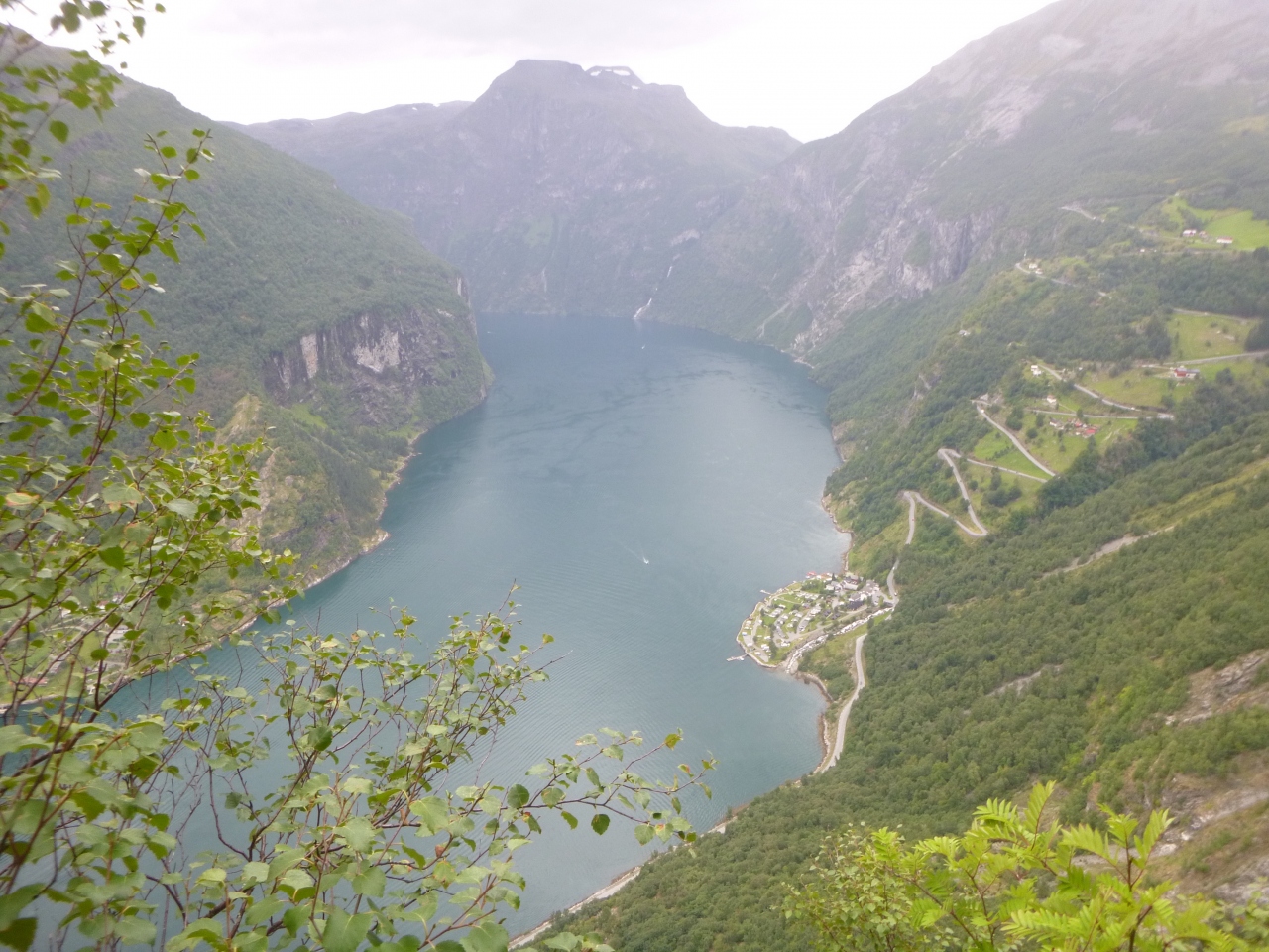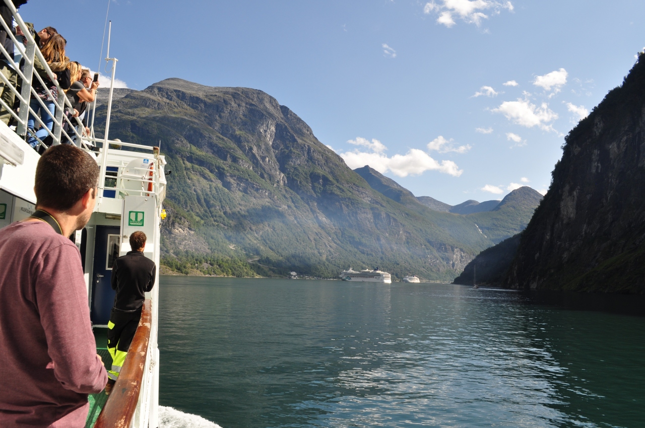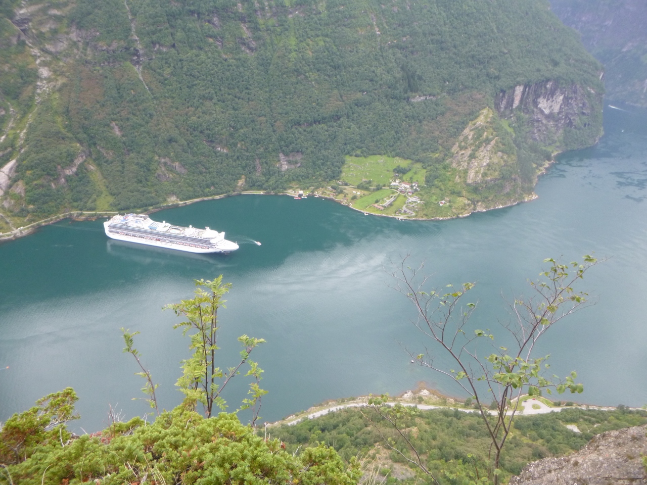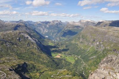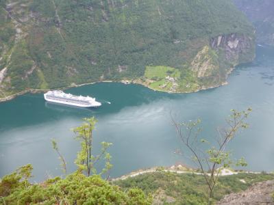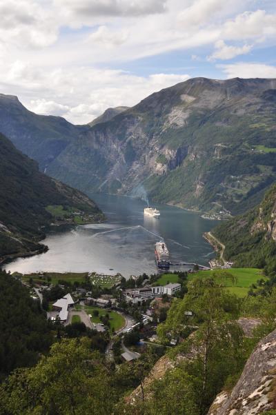 ガイランゲル村から登ってすぐの場所にあります、TVなどでよく見る場所です。フィヨルドと小さな村、クルーズ船がいい感じに見えます。レンタカーで行きましたが、麓から歩いて行くこともできます。景色がよく見える崖の淵は大人気でした。